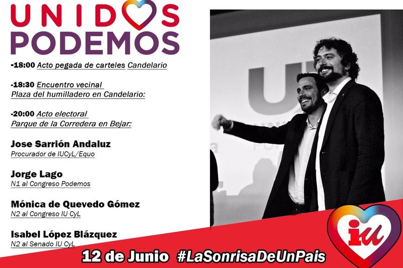 Hoy domingo, a las 20.00 h tendrá lugar en Béjar un acto de campaña de José Sarrión, procurador de Unidos Podemos en Las Cortes de Castilla y León. A este acto acudirá la mayor parte de la candidatura de este partido en la provincia.