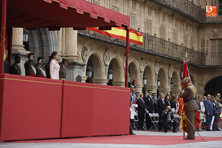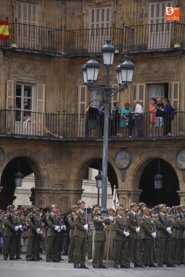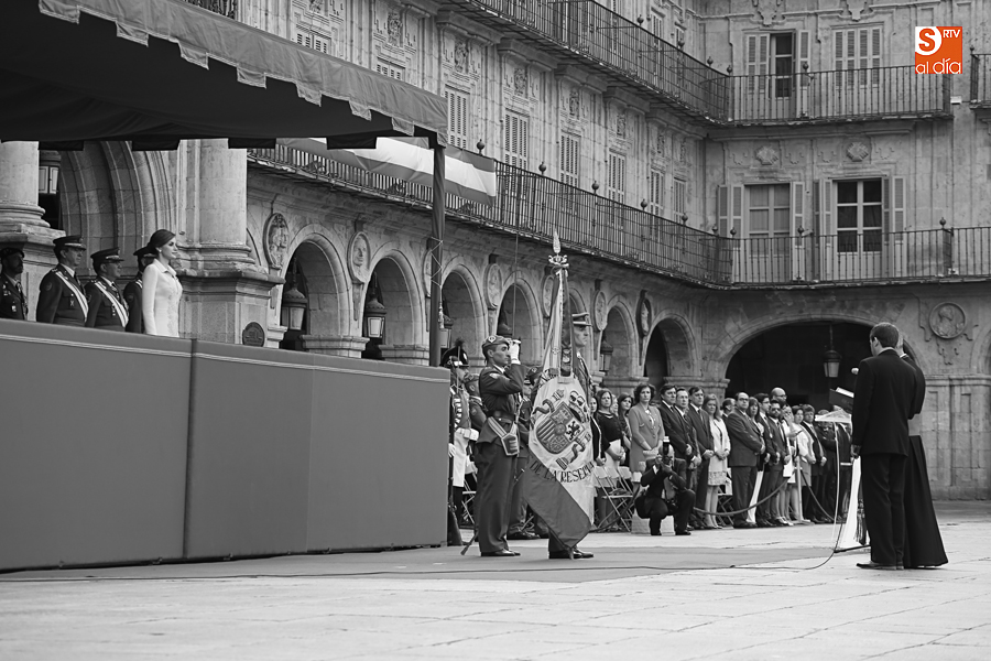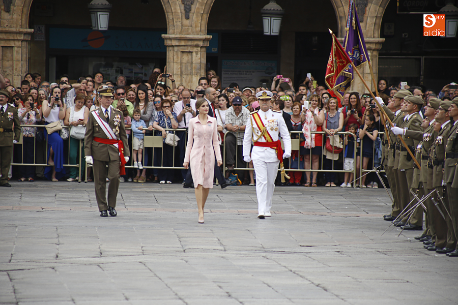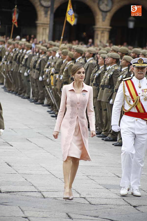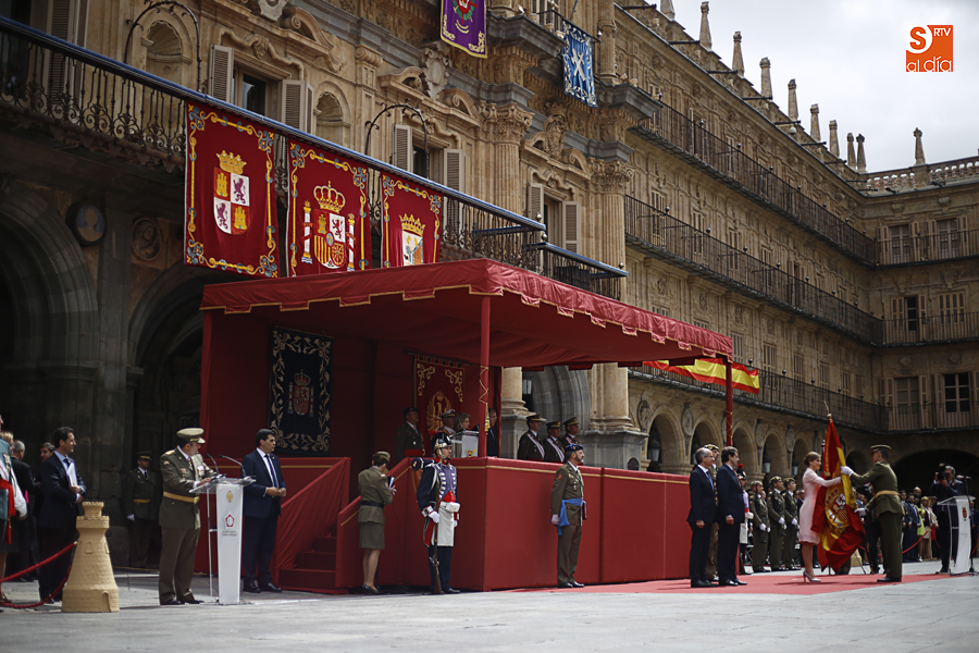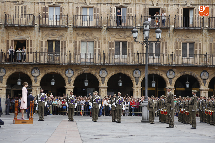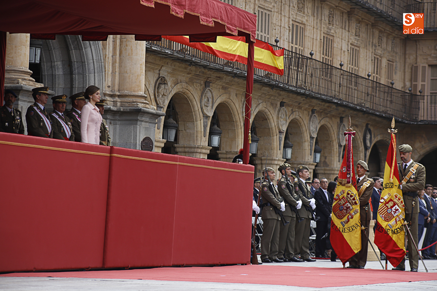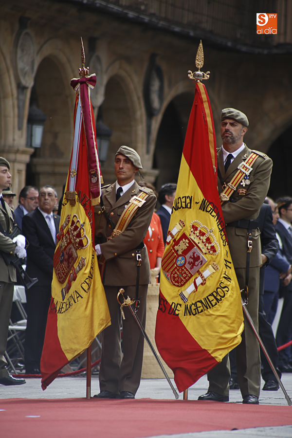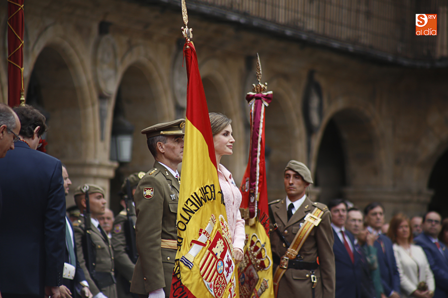 El solemne acto comenzó a las once de la mañana con la entrada en la Plaza Mayor de los miembros de la unidad del Regimiento de Ingenieros y que se llevaron la primera gran ovación de la jornada. Tras ellos, también desfilaron miembros de la Comandancia de la Guardia Civil de Salamanca y de la Base Aérea de Matacán. Tras su llegada a la Plaza, la Reina pasó revisión a las tropas y saludó al público congregado, que la recibió con aplausos, para después presidir la despedida de la bandera y la entrega de la nueva enseña que ha sido donada por el Ayuntamiento y la Diputación y bendecida por el vicario episcopal del Ejército de Tierra.