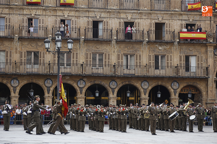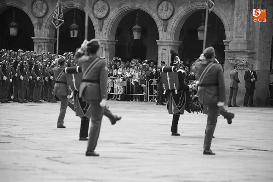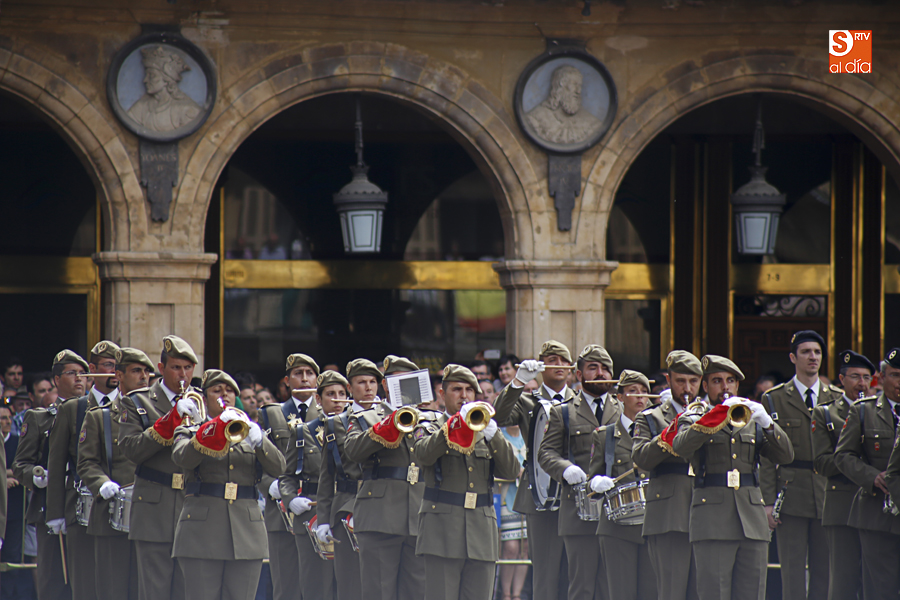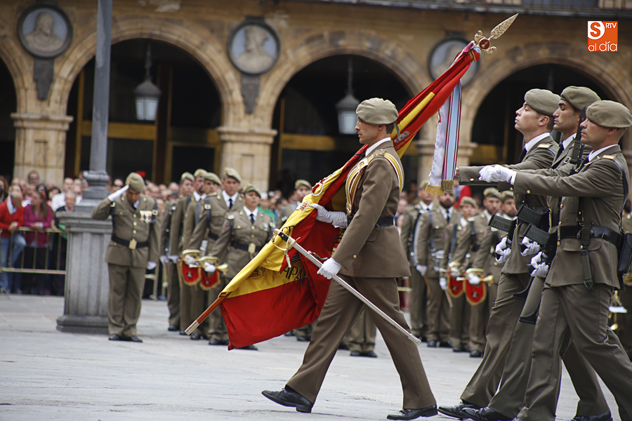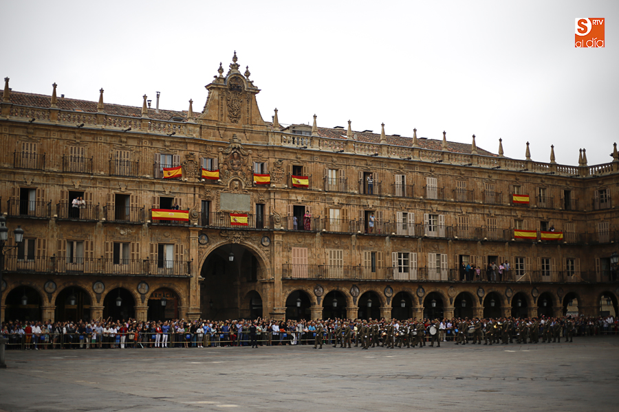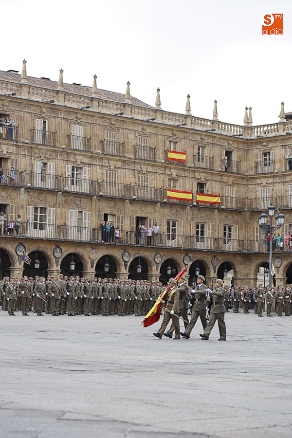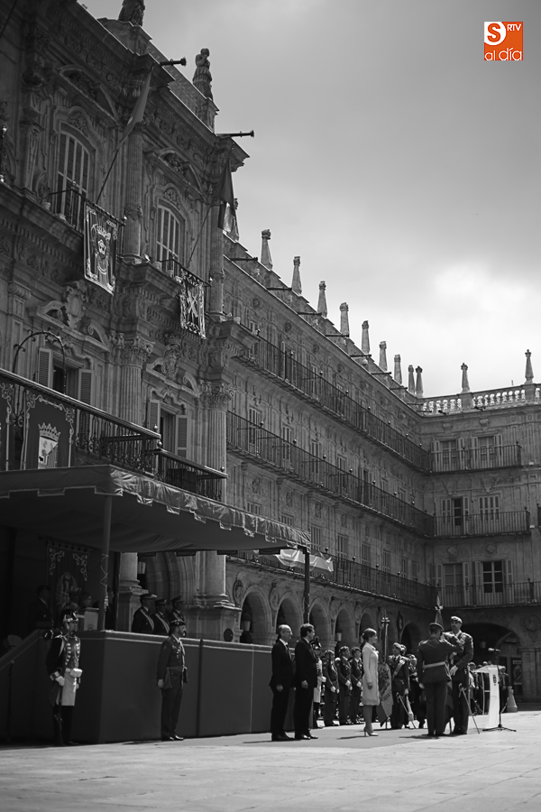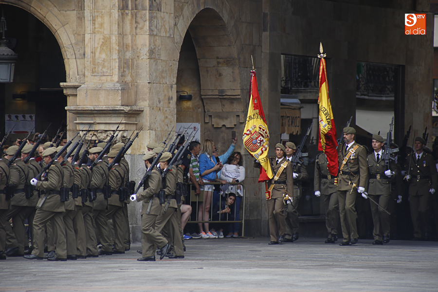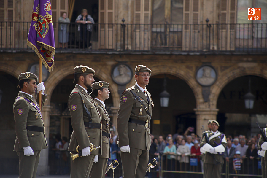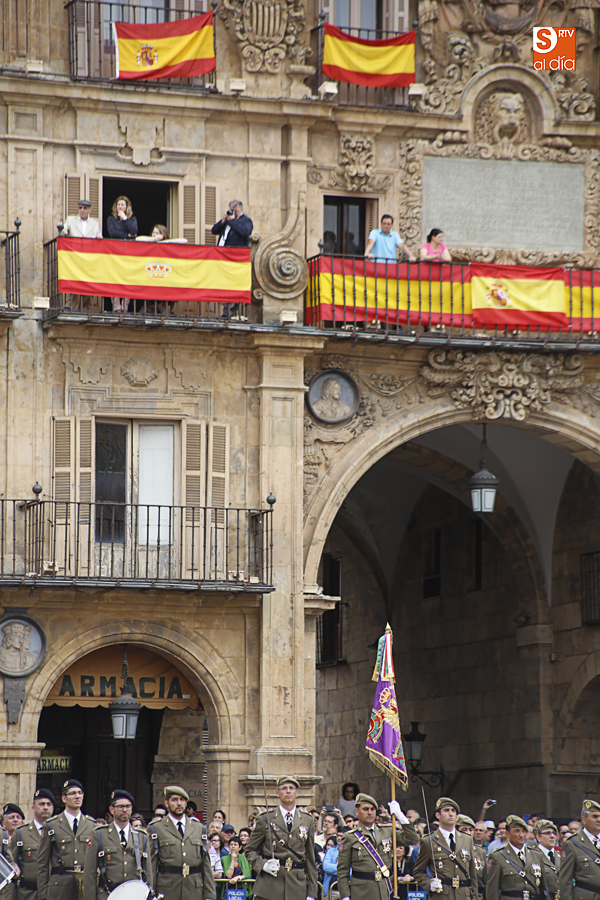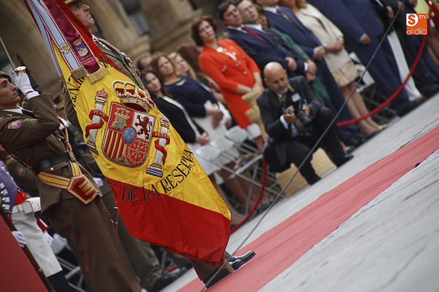 El solemne acto comenzó a las once de la mañana con la entrada en la Plaza Mayor de los miembros de la unidad del Regimiento de Ingenieros y que se llevaron la primera gran ovación de la jornada. Tras ellos, también desfilaron miembros de la Comandancia de la Guardia Civil de Salamanca y de la Base Aérea de Matacán. Tras su llegada a la Plaza, la Reina pasó revisión a las tropas y saludó al público congregado, que la recibió con aplausos, para después presidir la despedida de la bandera y la entrega de la nueva enseña que ha sido donada por el Ayuntamiento y la Diputación y bendecida por el vicario episcopal del Ejército de Tierra.