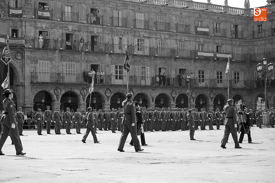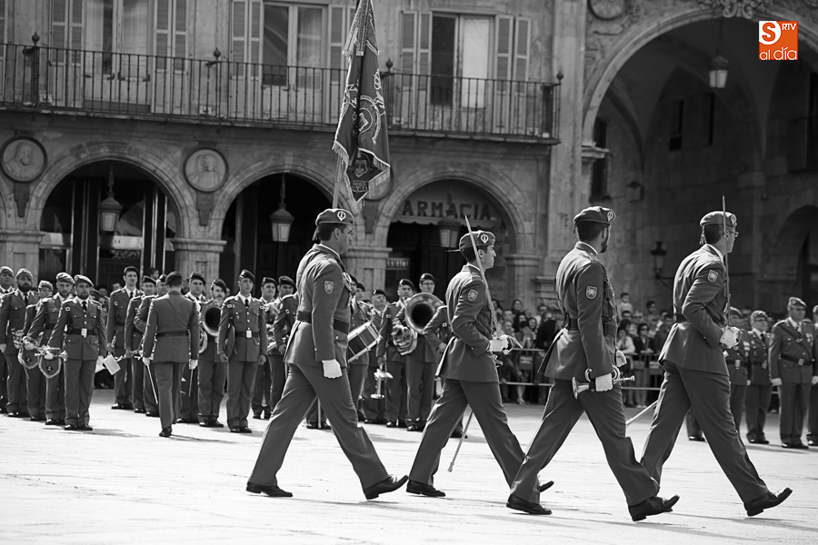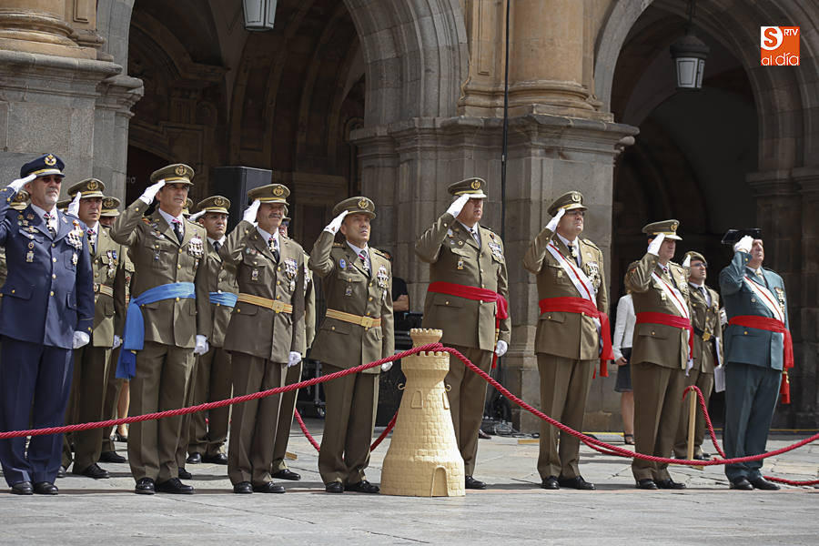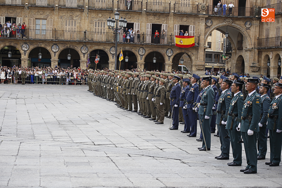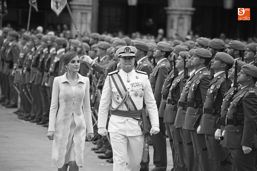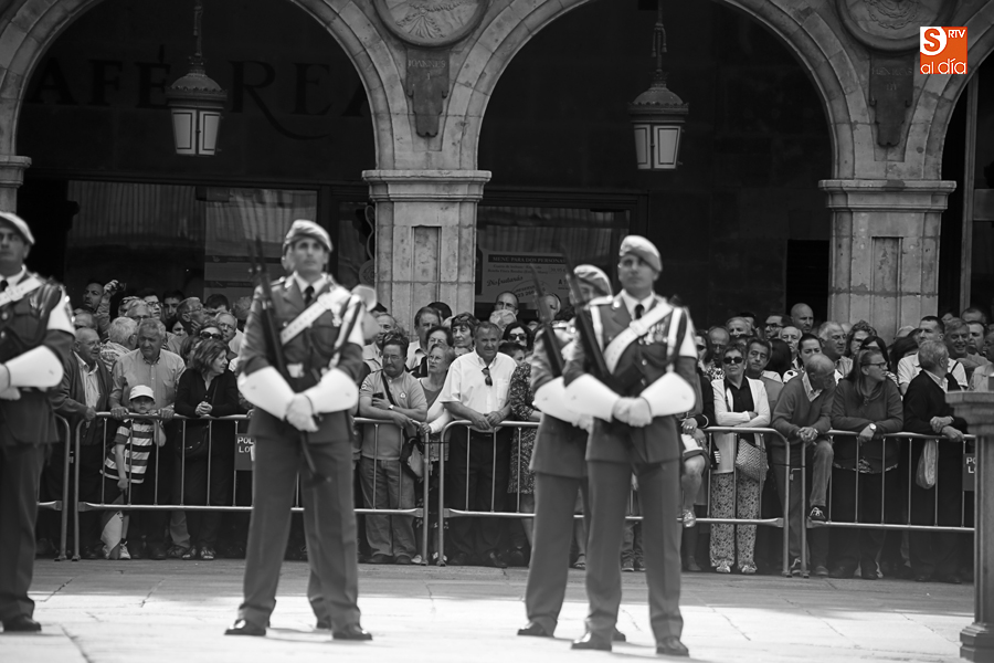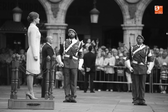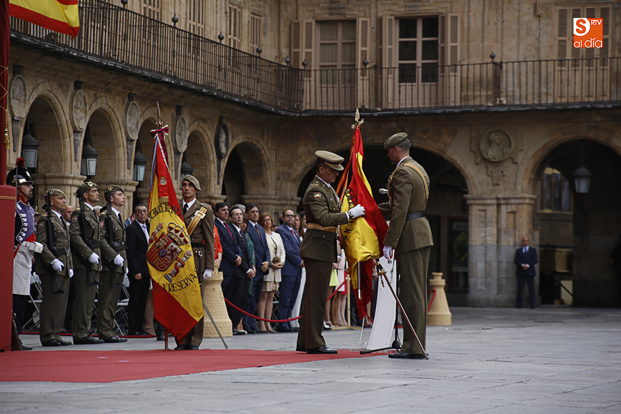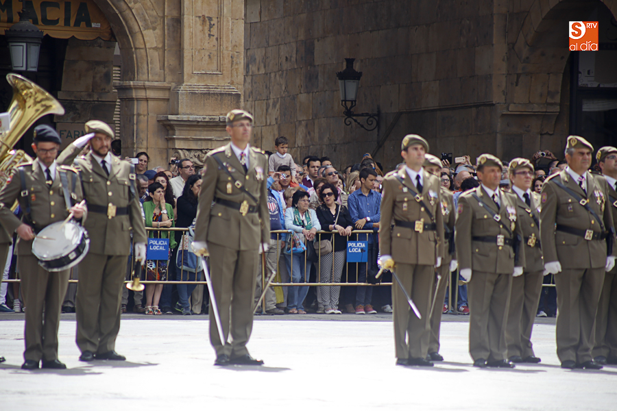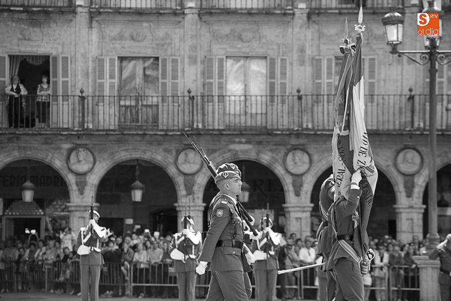 El solemne acto comenzó a las once de la mañana con la entrada en la Plaza Mayor de los miembros de la unidad del Regimiento de Ingenieros y que se llevaron la primera gran ovación de la jornada. Tras ellos, también desfilaron miembros de la Comandancia de la Guardia Civil de Salamanca y de la Base Aérea de Matacán. Tras su llegada a la Plaza, la Reina pasó revisión a las tropas y saludó al público congregado, que la recibió con aplausos, para después presidir la despedida de la bandera y la entrega de la nueva enseña que ha sido donada por el Ayuntamiento y la Diputación y bendecida por el vicario episcopal del Ejército de Tierra.