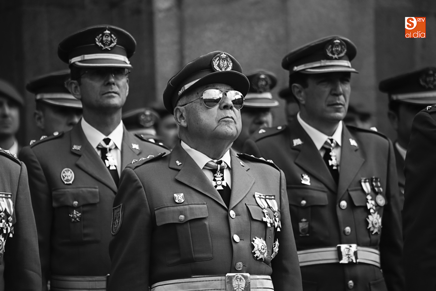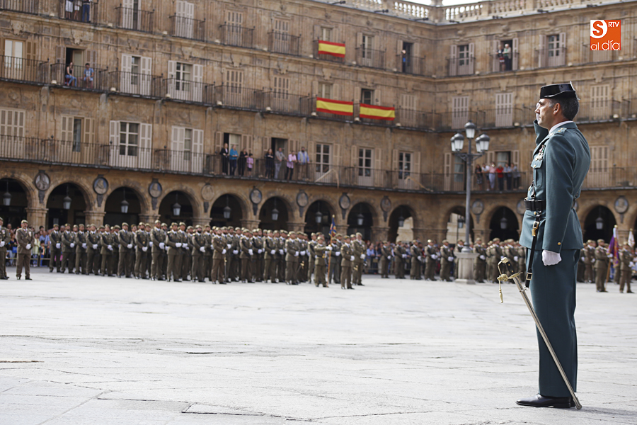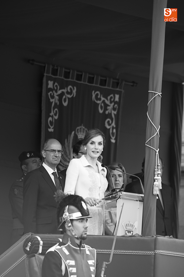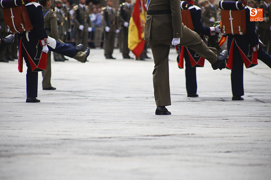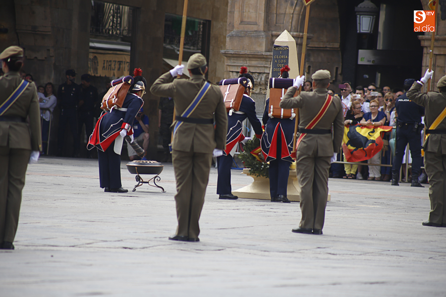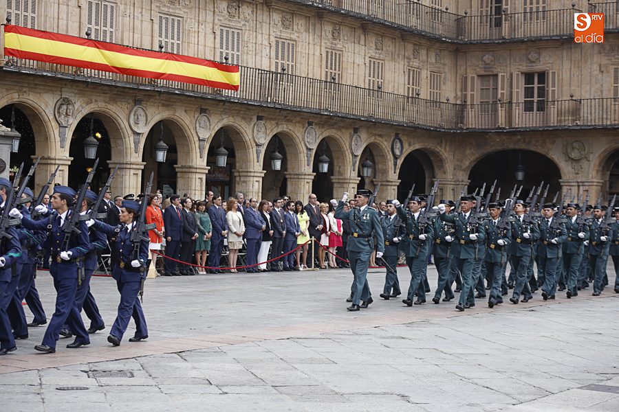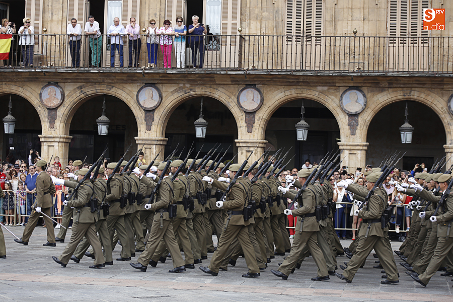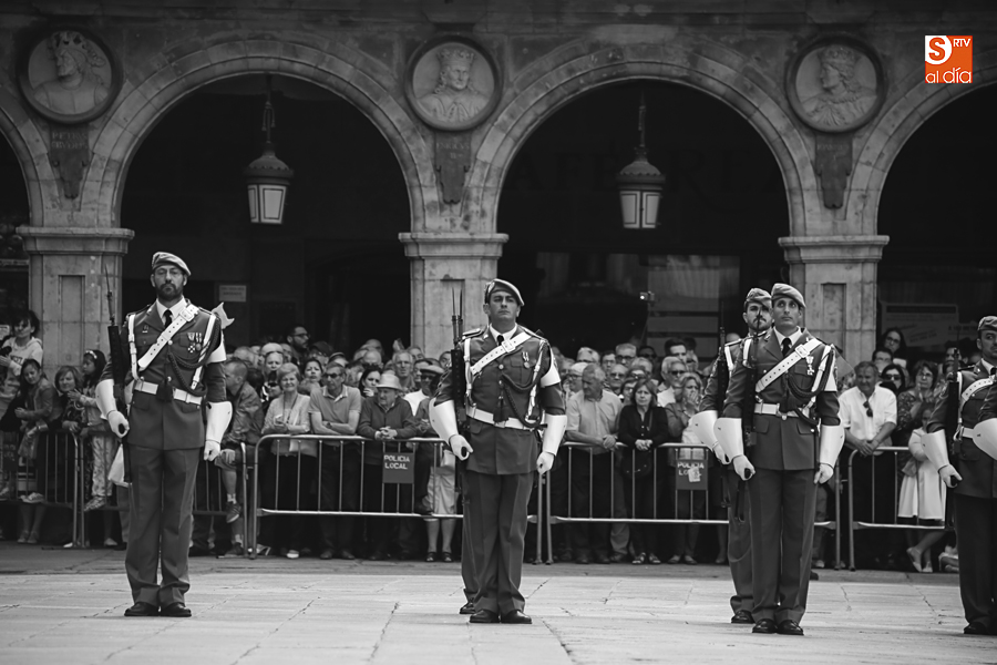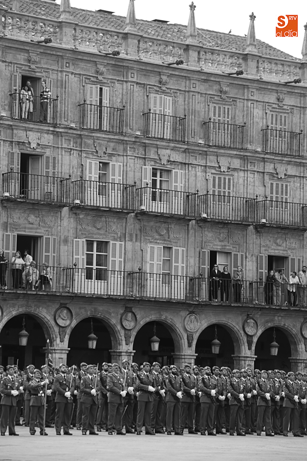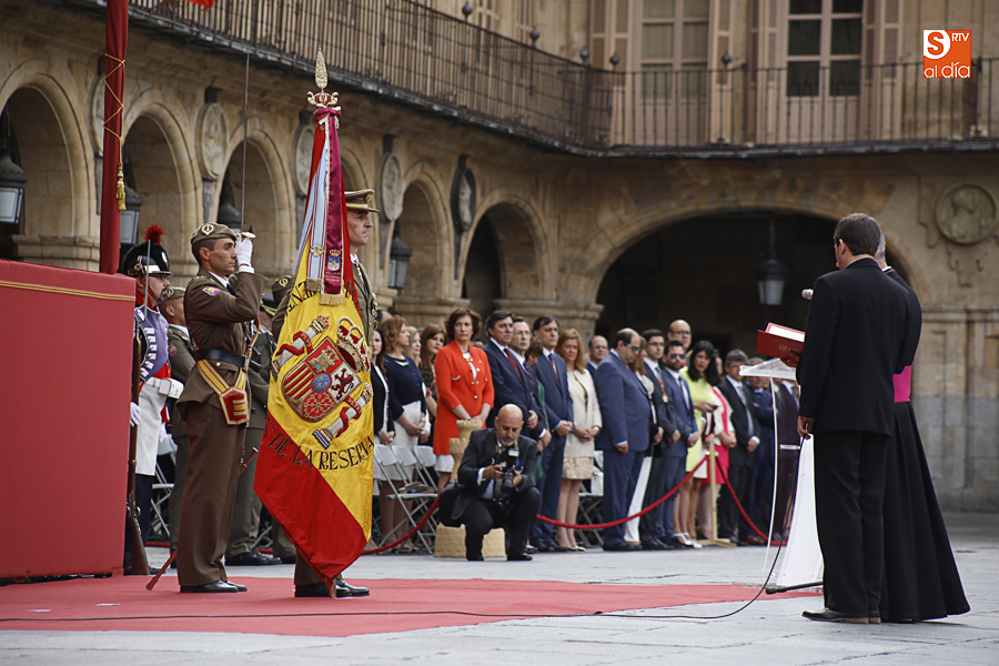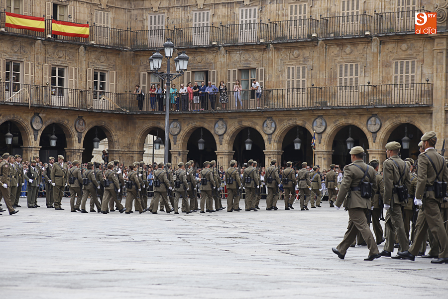 El solemne acto comenzó a las once de la mañana con la entrada en la Plaza Mayor de los miembros de la unidad del Regimiento de Ingenieros y que se llevaron la primera gran ovación de la jornada. Tras ellos, también desfilaron miembros de la Comandancia de la Guardia Civil de Salamanca y de la Base Aérea de Matacán. Tras su llegada a la Plaza, la Reina pasó revisión a las tropas y saludó al público congregado, que la recibió con aplausos, para después presidir la despedida de la bandera y la entrega de la nueva enseña que ha sido donada por el Ayuntamiento y la Diputación y bendecida por el vicario episcopal del Ejército de Tierra.