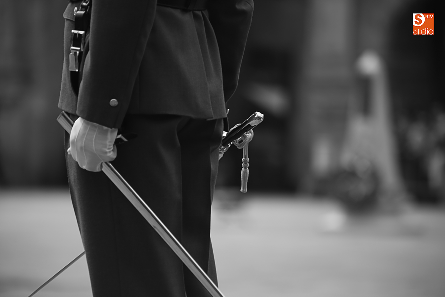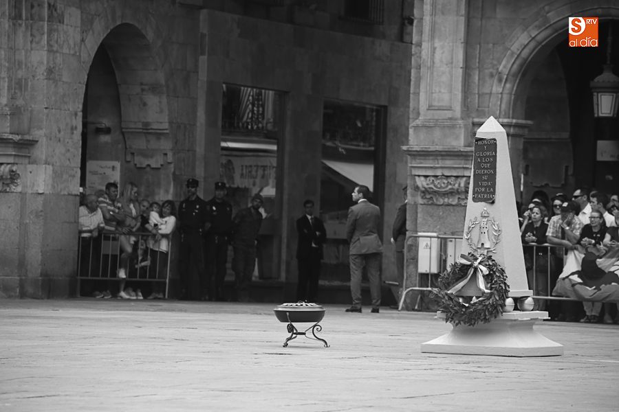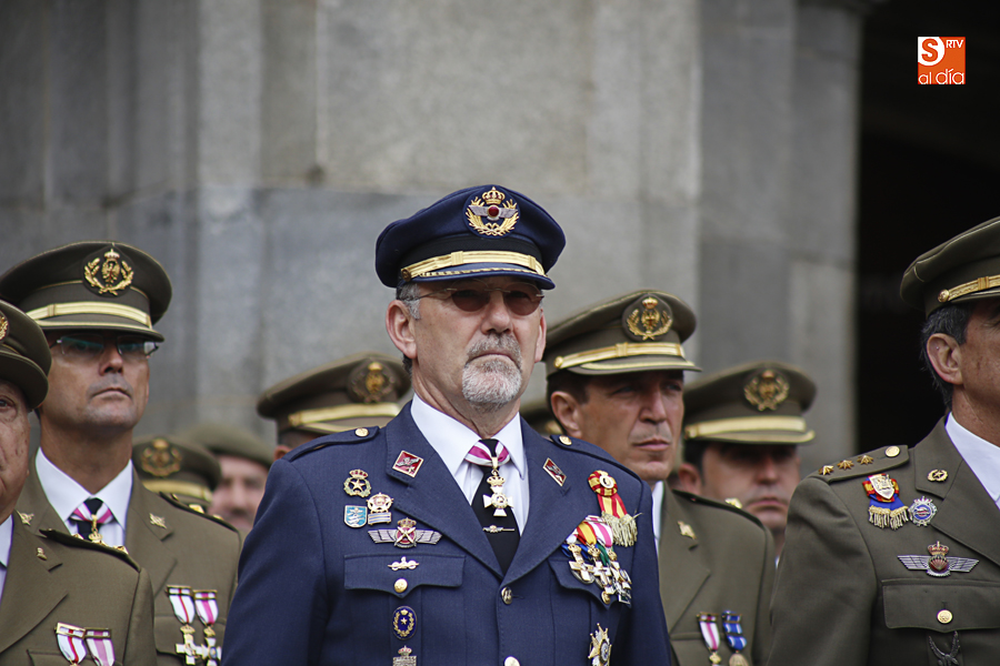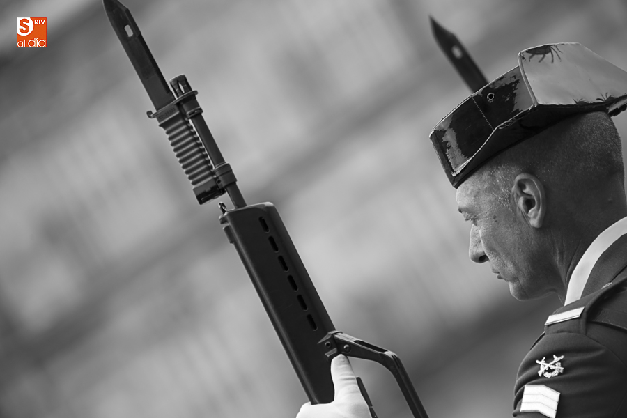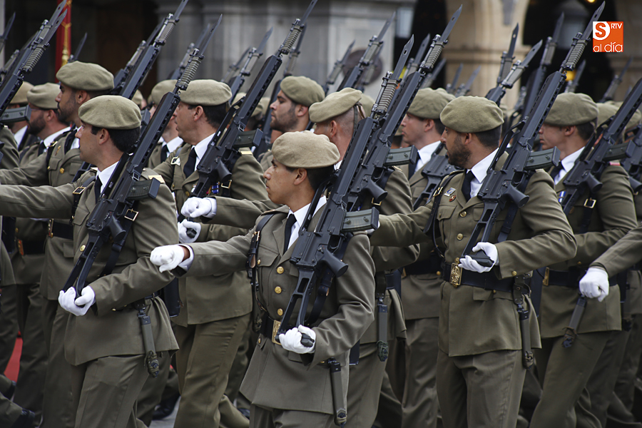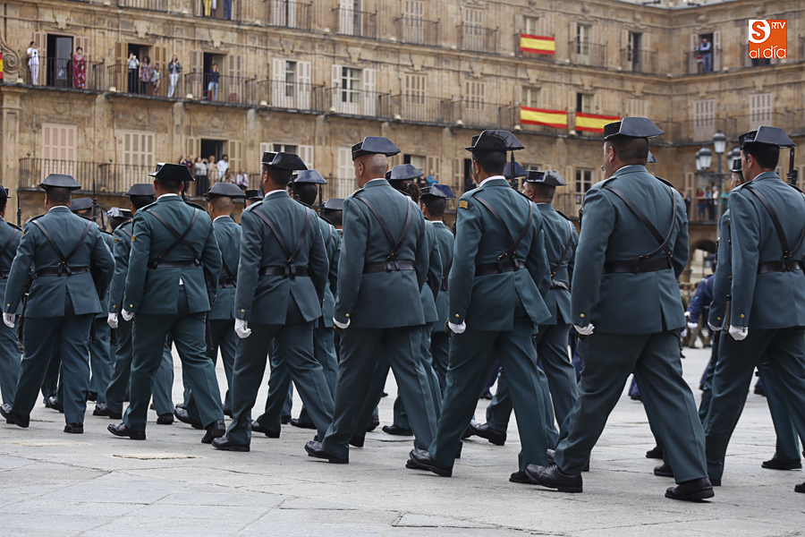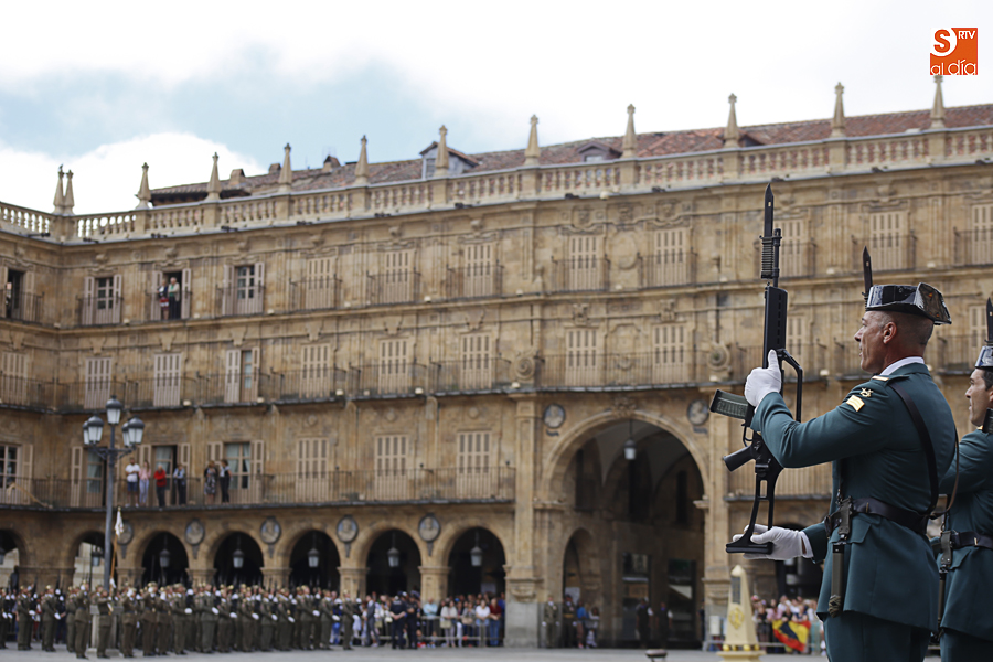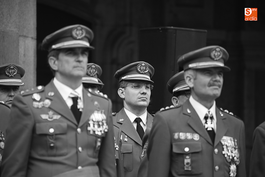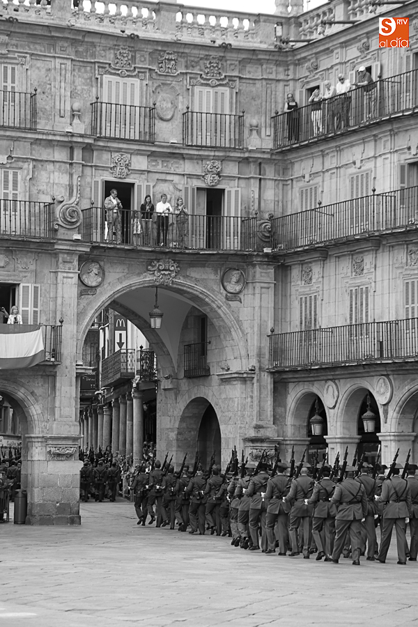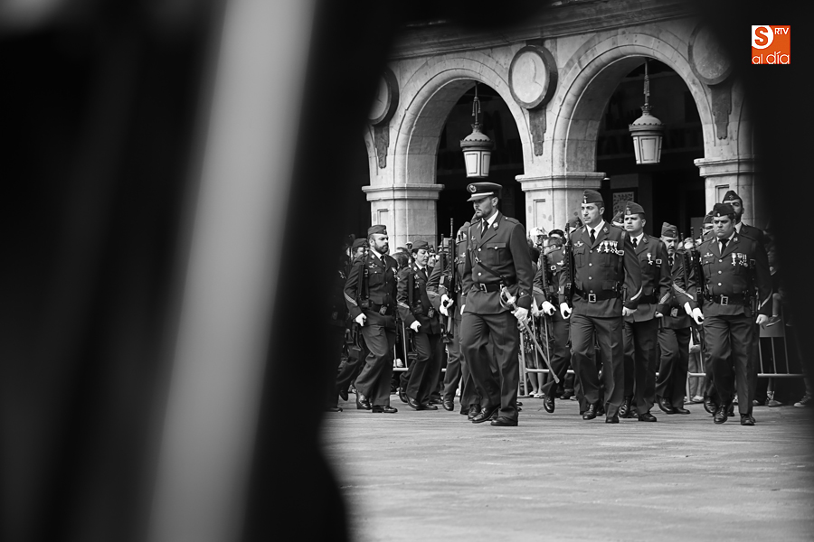 El solemne acto comenzó a las once de la mañana con la entrada en la Plaza Mayor de los miembros de la unidad del Regimiento de Ingenieros y que se llevaron la primera gran ovación de la jornada. Tras ellos, también desfilaron miembros de la Comandancia de la Guardia Civil de Salamanca y de la Base Aérea de Matacán. Tras su llegada a la Plaza, la Reina pasó revisión a las tropas y saludó al público congregado, que la recibió con aplausos, para después presidir la despedida de la bandera y la entrega de la nueva enseña que ha sido donada por el Ayuntamiento y la Diputación y bendecida por el vicario episcopal del Ejército de Tierra.