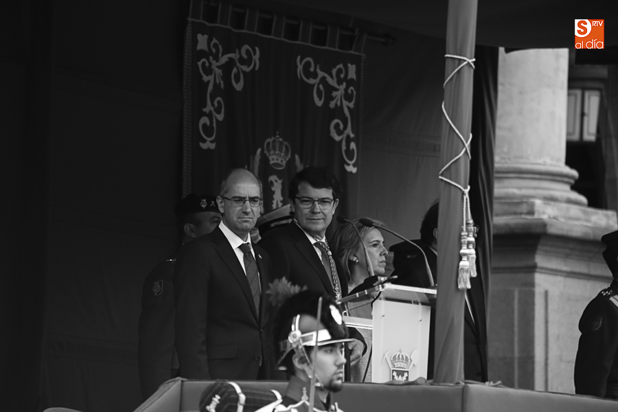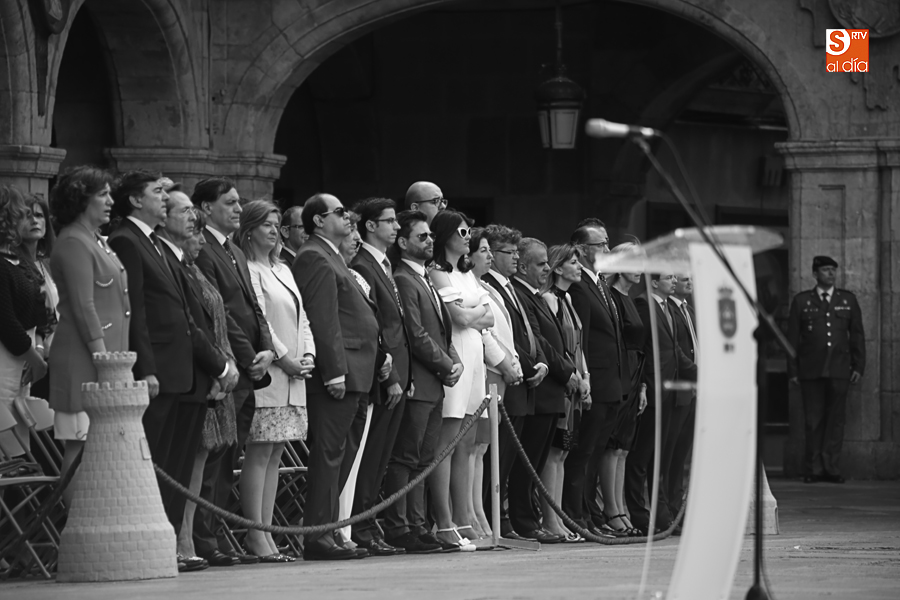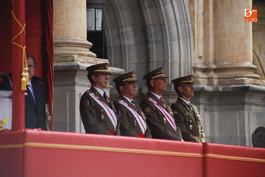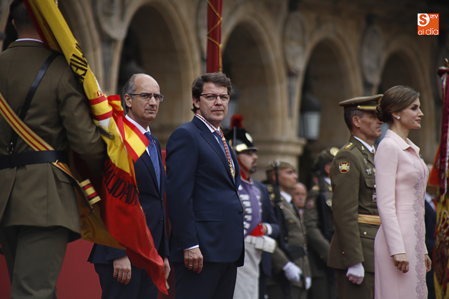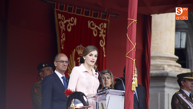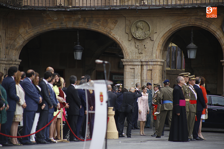 El presidente de la Junta de Castilla y León, Juan Vicente Herrera, el jefe de Estado Mayor del Ejército de Tierra, general de Ejército Jaime Domínguez-Buj, así como la delegada del Gobierno en Castilla y León, María José Salgueiro, el alcalde de Salamanca, Alfonso Fernández Mañueco, y el presidente de la Diputación, Javier Iglesias, han estado junto a la Reina Doña Letizia en la tribuna instalada bajo el Ayuntamiento. A la izquierda del Consistorio se encontraba la Corporación municipal al competo, junto a otros representantes políticos locales y regionales.
