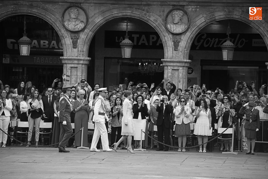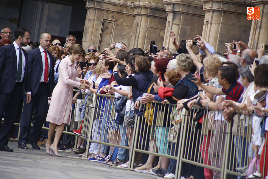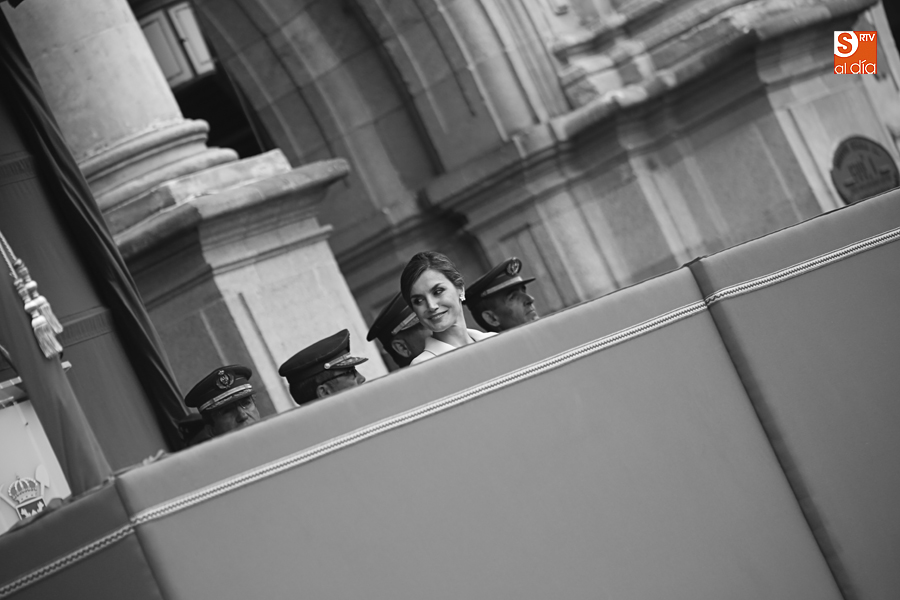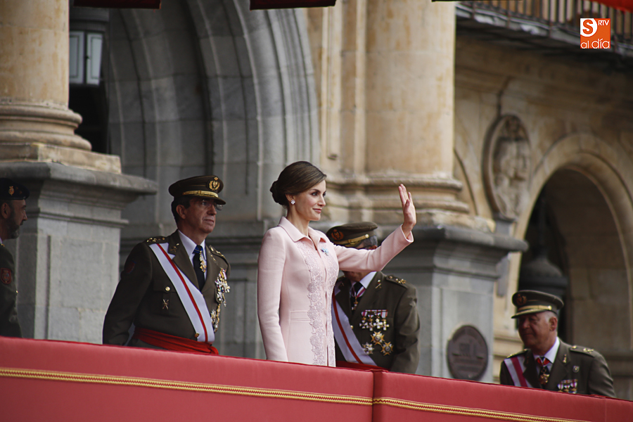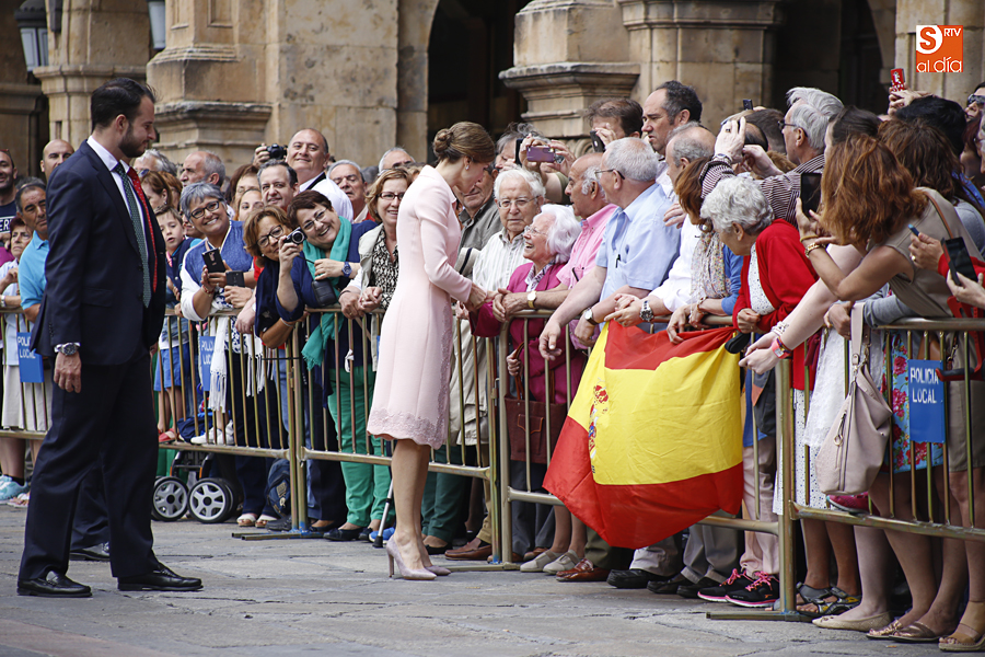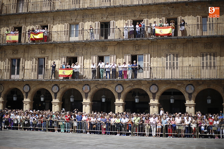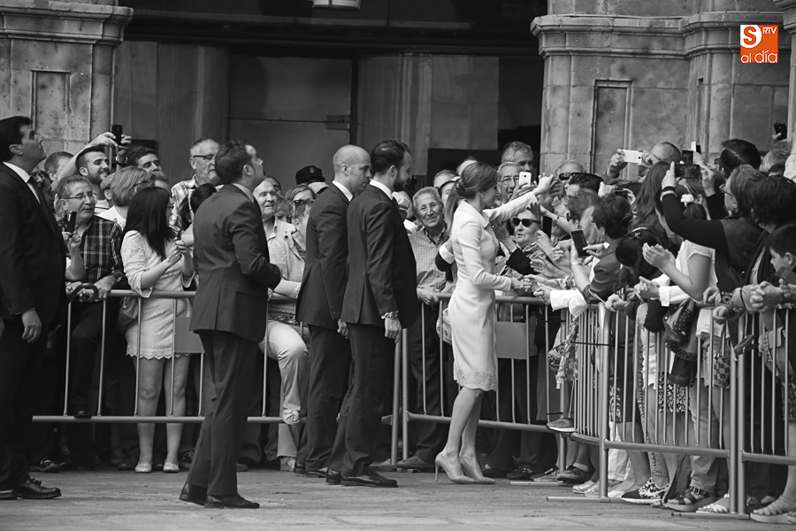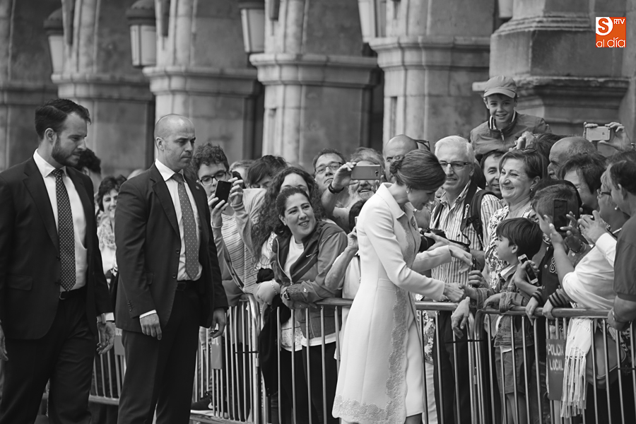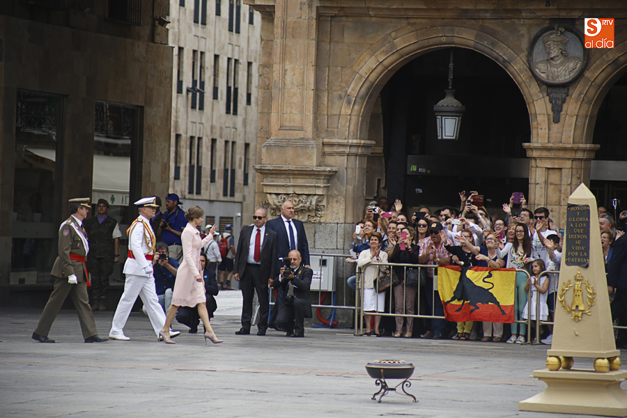 Como madrina de la bandera del Regimiento de Ingenieros, la Reina ha estado acompañada por autoridades locales y regionales, autoridades militares y por decenas de salmantinos que han seguido con gran interés el acto tras las vallas colocadas en la Plaza Mayor y desde los balcones y que han mostrado su cariño a Doña Letizia, que una vez concluido el acto, se ha acercado a saludar a las personas que allí se encontraban.