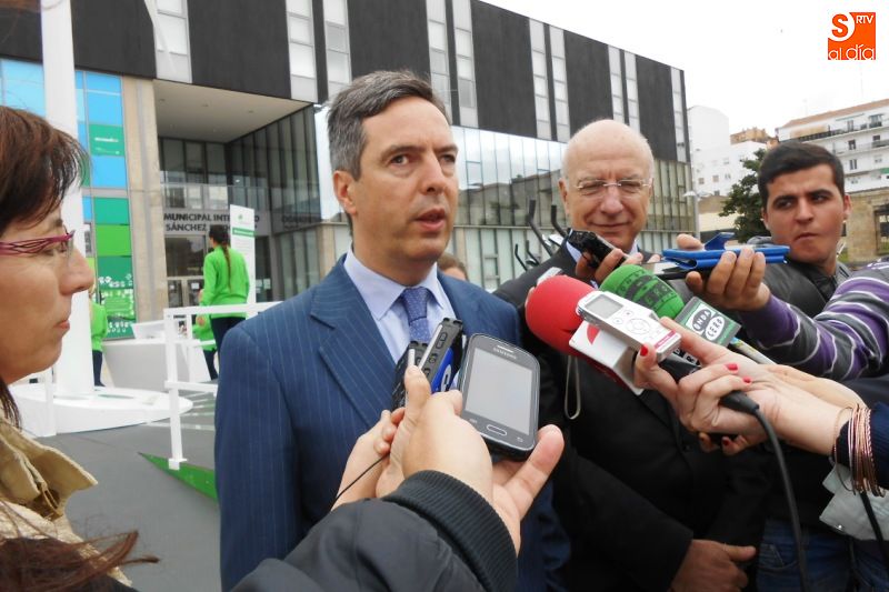 El concejal de Economía y Deportes, Enrique Sánchez-Guijo, y el delegado de Iberdrola en Castilla y León, Joaquín Boneta, fueron los encargados de poner en marcha en la Plaza de la Concordia el Molino Eólico de Iberdrola que forma parte del Festival de Luz y Vanguardias que se celebra desde mañana hasta el día 19 de junio.