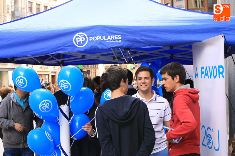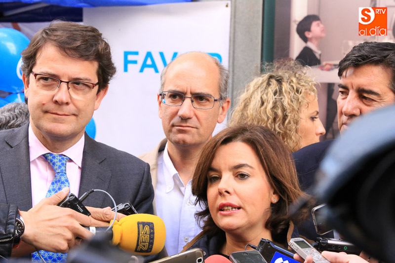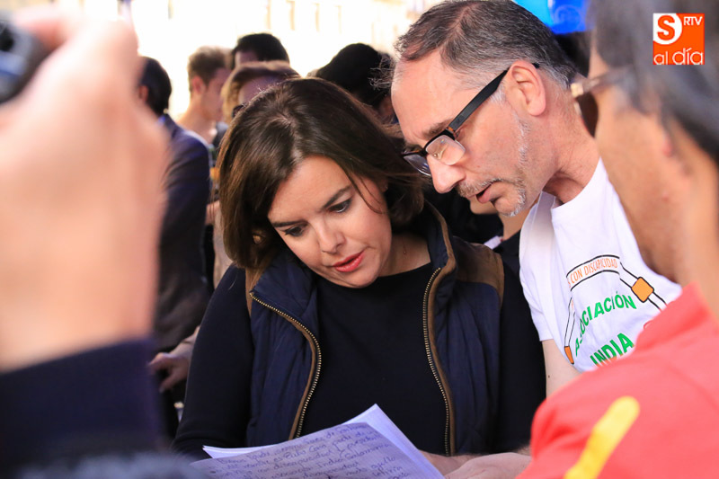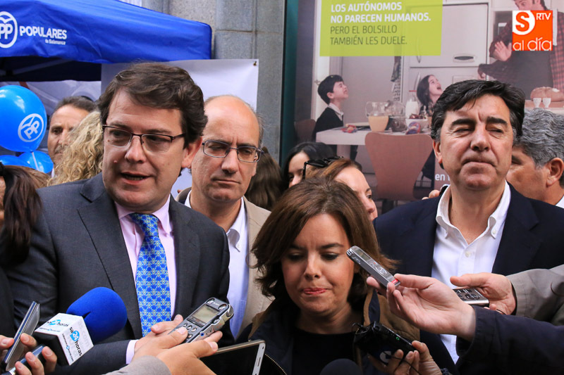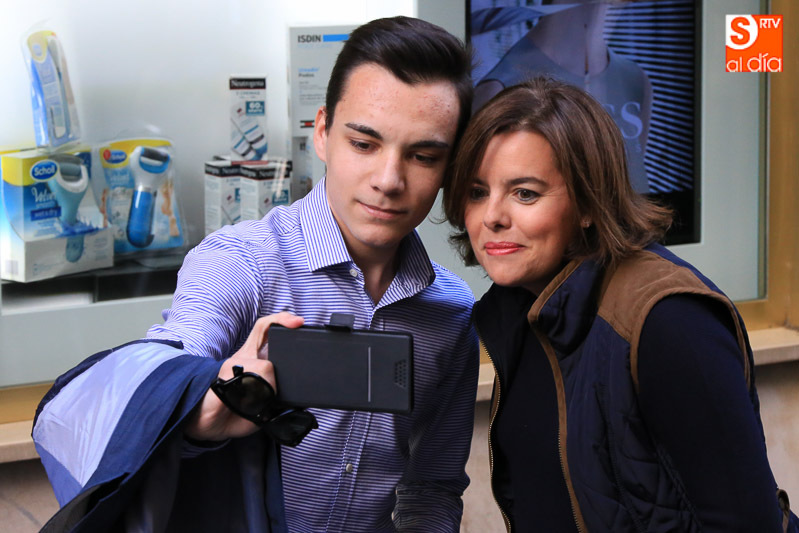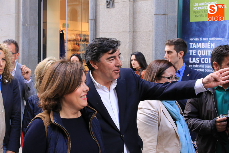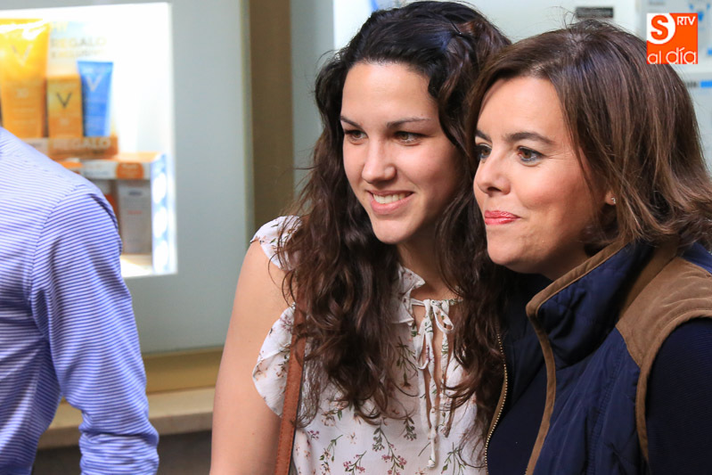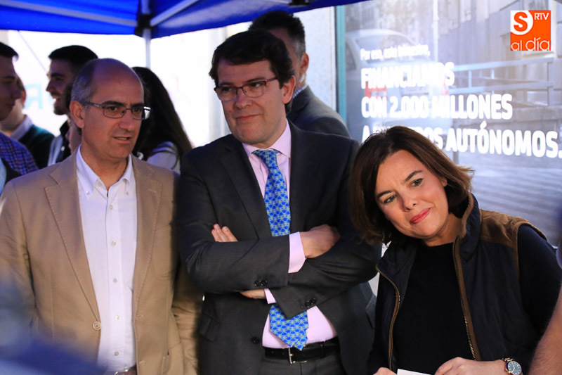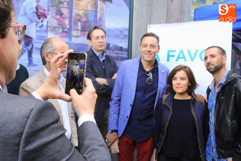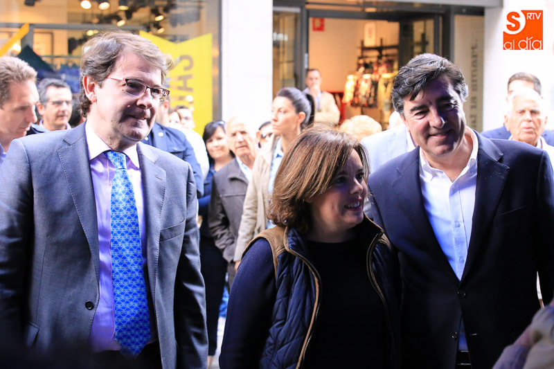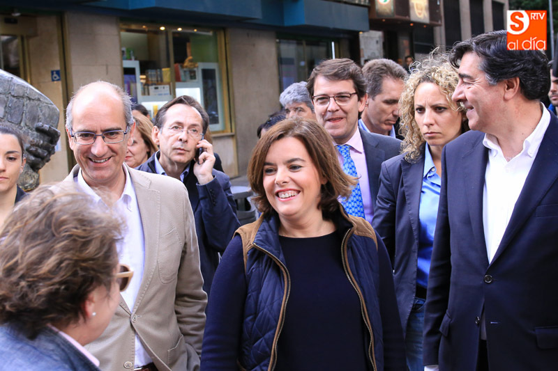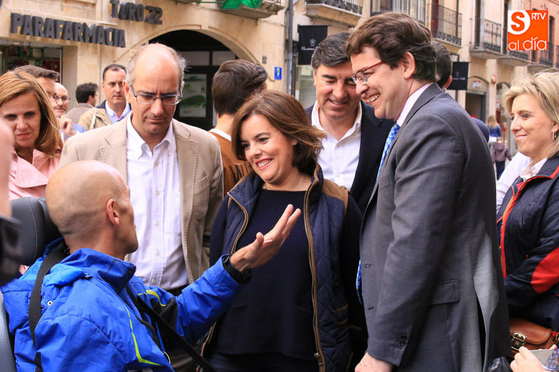 La vicepresidenta del Gobierno en funciones, Soraya Sáenz de Santamaría, ha visitado esta tarde la capital para acompañar a los populares salmantinos en el ecuador de la campaña electoral y participar en un acto en el Hotel Corona Sol con afiliados y simpatizantes del Partido Popular. Acompañada el presidente del Partido Popular de Salamanca, Javier Iglesias, el candidato número uno al Congreso de los Diputados, José Antonio Bermúdez de Castro, y el secretario regional del PP, Alfonso Fernández Mañueco, la vicepresidenta ha hecho una parada en la carpa del PP, en la calle Toro, antes de iniciar un paseo por las calles céntricas de la ciudad.