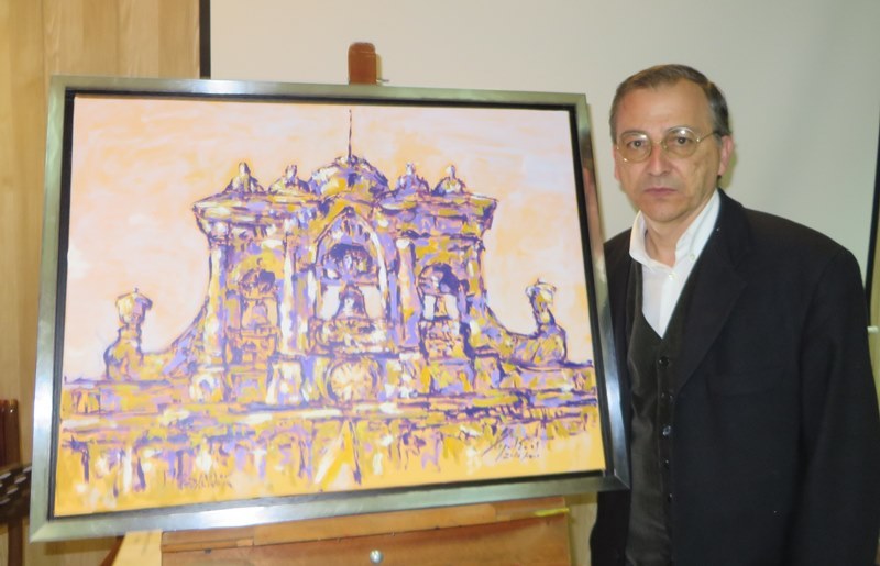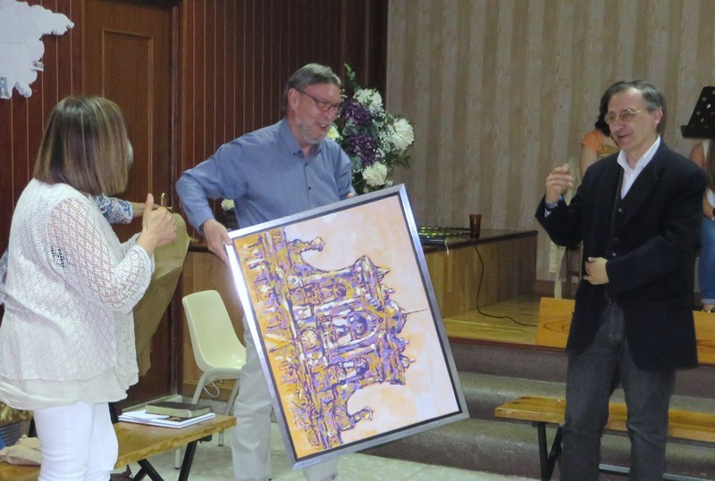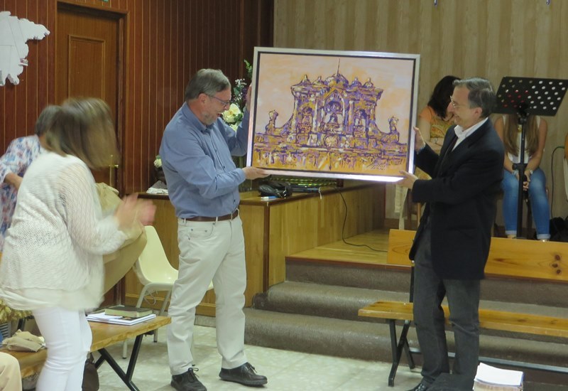 En un acto celebrado el sábado 18, a las 19,00 horas y en la sede de la Iglesia Cristiana Evangélica de Salamanca (Paseo de la estación, 32), el reconocido pintor Miguel Elías, profesor de la Universidad de Salamanca, hizo entrega de su obra más reciente, 'El reloj de la Plaza' (80cm x 60 cm. Técnica mixta sobre lienzo).