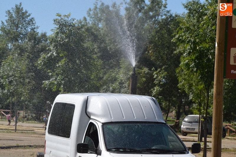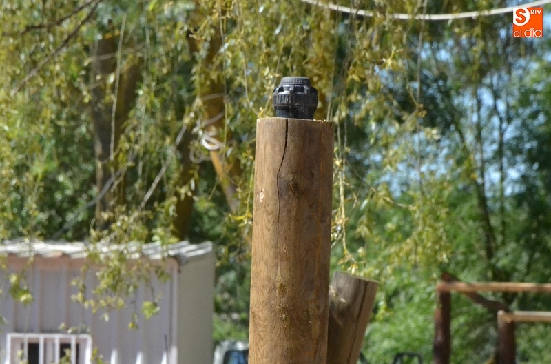 A diferencia del sistema implantado en El Picón, el colocado en los parkings es aéreo, saliendo el agua desde unos dispositivos situados sobre unos troncos de madera repartidos por ambos parkings.