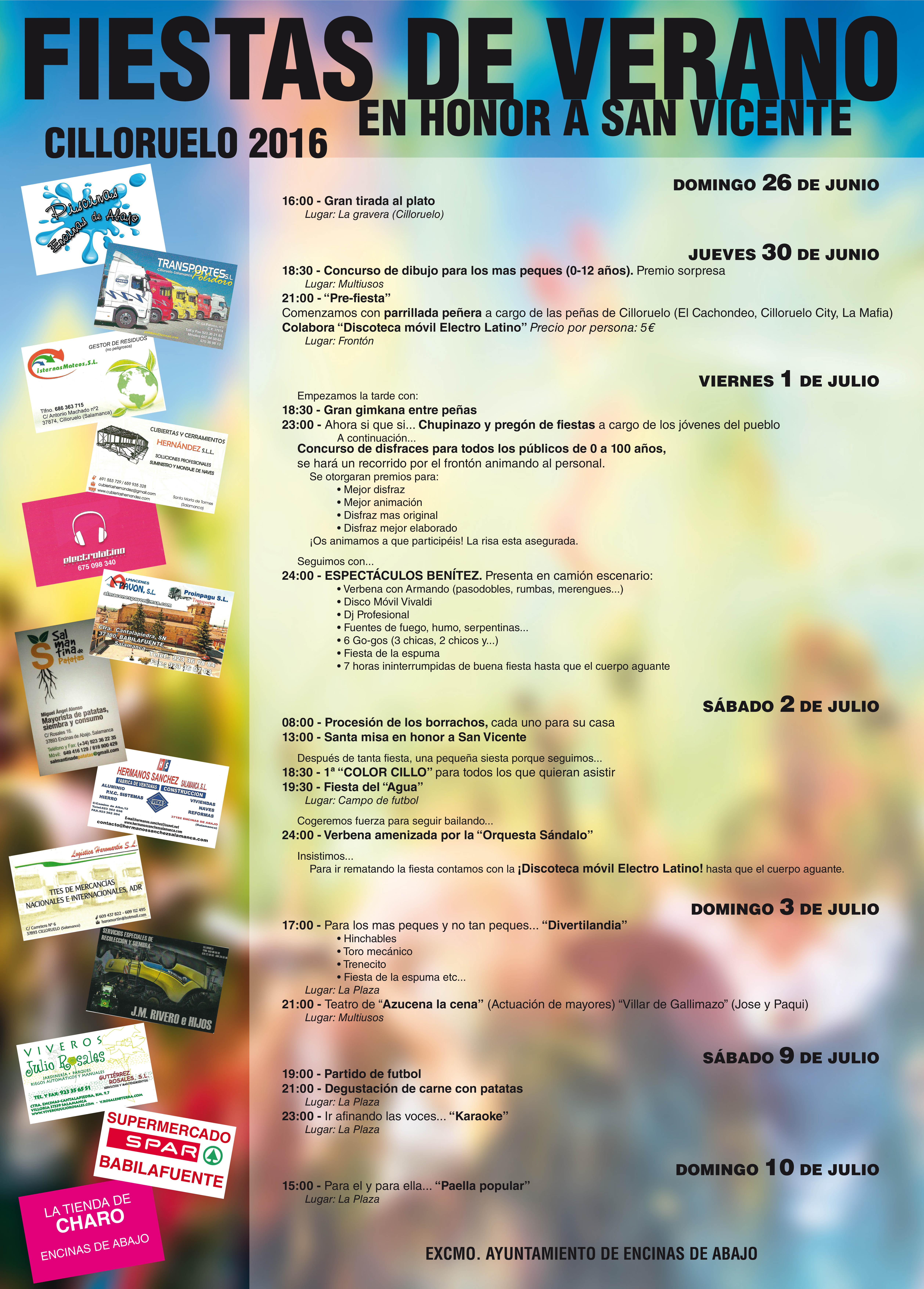 Los vecinos de Cilloruelo esperan con ganas el comienzo de las fiestas patronales en honor a San Vicente. El programa festivo se inicia con la gran tirada al plato del sábado 25, y continúa con bailes, comidas populares y mucha diversión. El pregón, que tendrá lugar el viernes 1 de julio, correrá a cargo de los jóvenes del pueblo, tras el que tendrá lugar una gran noche de fiesta con la Disco Móvil Vivaldi.