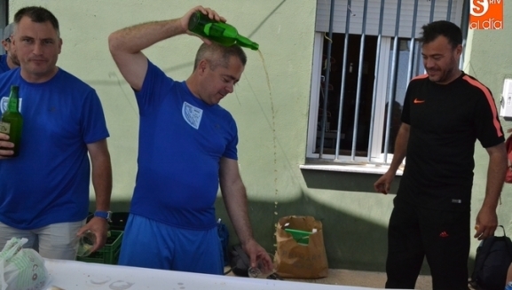 De cara a este viaje, el Lugones ha llegado a Miróbriga bien cargado de botellas de sidra para darla a probar entre todos los adultos mirobrigenses involucrados en la competición deportiva, que se está desarrollando durante esta jornada sabatina en los Campos de Toñete.