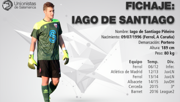El portero Iago de Santiago reforzará la portería de Unionistas de Salamanca en el debut del club en Tercera División. El joven guardameta, que ocupa ficha de menor de 23 años, defenderá la meta blanquinegra junto a Javi Díaz.