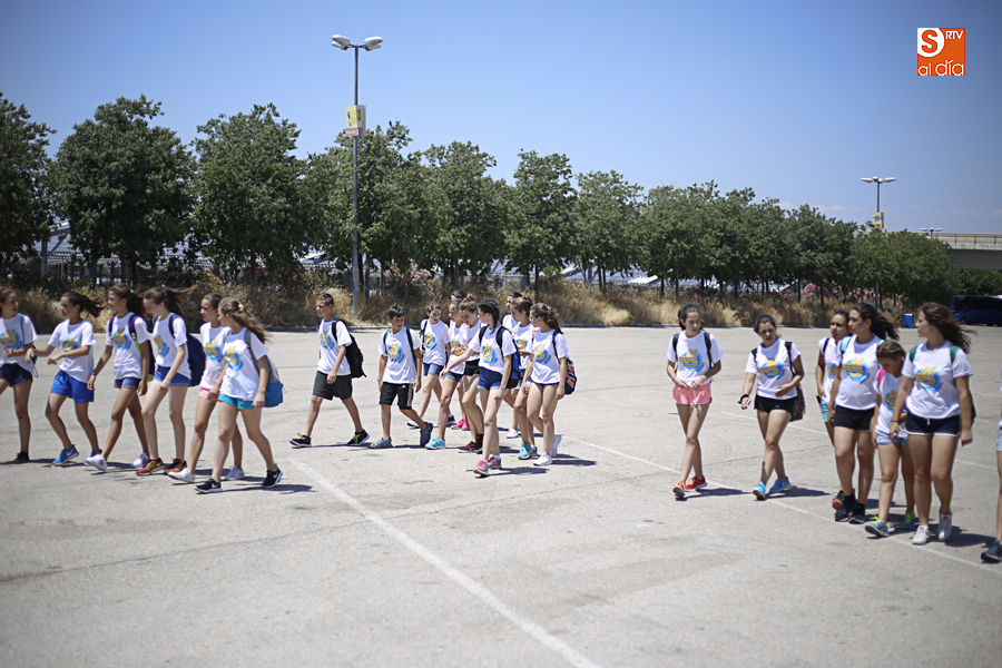 Y al quinto día, madrugón. Pero con una sonrisa en la boca y todos como un reloj antes de que el reloj marcara las ocho de la mañana en una calurosa mañana de julio a las puertas del pabellón de Carbajosa. Los padres contentos, los entrenadores y ayudantes expectantes y los niños y niñas entusiasmados. ¡Nos vamos a la Warner!