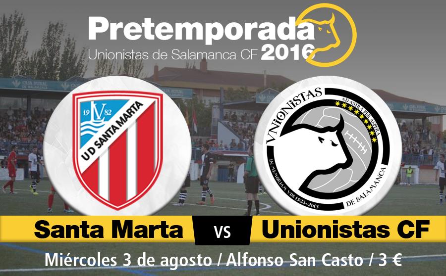 La Unión Deportiva Santa Marta y Unionistas CF disputarán un encuentro amistoso de pretemporada el próximo 3 de agosto en el estadio Alfonso San Casto, en horario vespertino que está aún por determinar. El encuentro será el primero de pretemporada para el equipo de Arturo Martín, que comenzará días antes su preparación para afrontar en la mejor disposición posible la nueva temporada en Regional Aficionados.