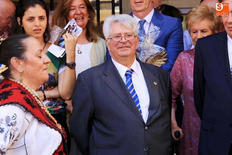 El empresario salmantino Manuel Estévez y el director de la Casa Lis, Pedro Pérez Castro, han sido homenajeados este domingo, junto al Edificio Histórico de la Universidad de Salamanca, con motivo del Día del Asociacionismo Vecinal del Barrio Antiguo.