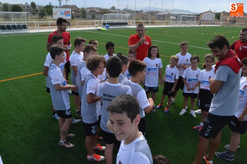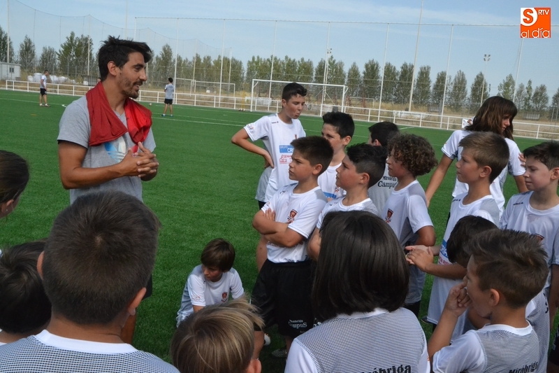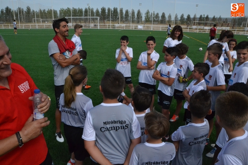 El Miróbriga Campus arrancó con una ilustre visita, la del jugador del Alavés -natural de La Fuente de San Esteban- Javier Carpio, que acaba de ascender con su equipo a 1ª División. Javier Carpio participó en las sesiones de entrenamiento, y también tuvo la oportunidad de departir con los chavales, que le hicieron preguntas de todo tipo así como dos 'encargos': que le haga un caño a Messi cuando juegue contra él, y que cuando le hagan una entrevista, hable de los chavales del Campus.