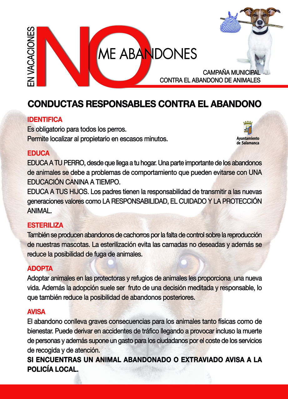 El Ayuntamiento de Salamanca ha puesto en marcha esta semana una nueva campaña estival para promover la tenencia responsable de animales de compañía y reducir las cifras de abandono de los mismos. Bajo el lema "No me abandones en vacaciones", el Ayuntamiento persigue sensibilizar a los salmantinos de la responsabilidad de tener una mascota e invita a los vecinos al disfrute de las vacaciones en compañía de las mascotas o su custodia en lugares adecuados durante el verano.
