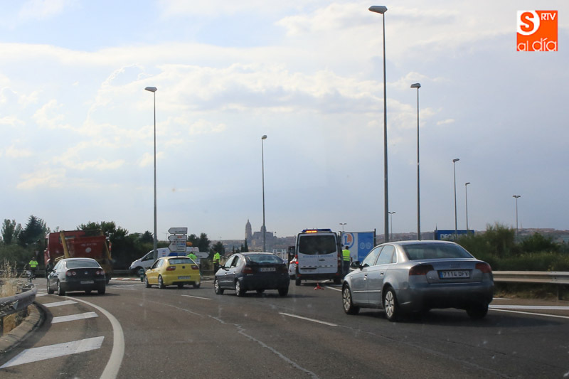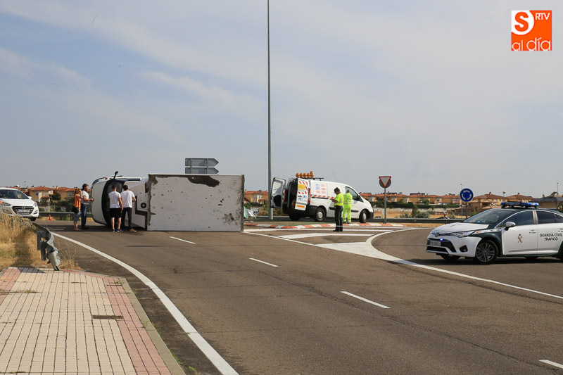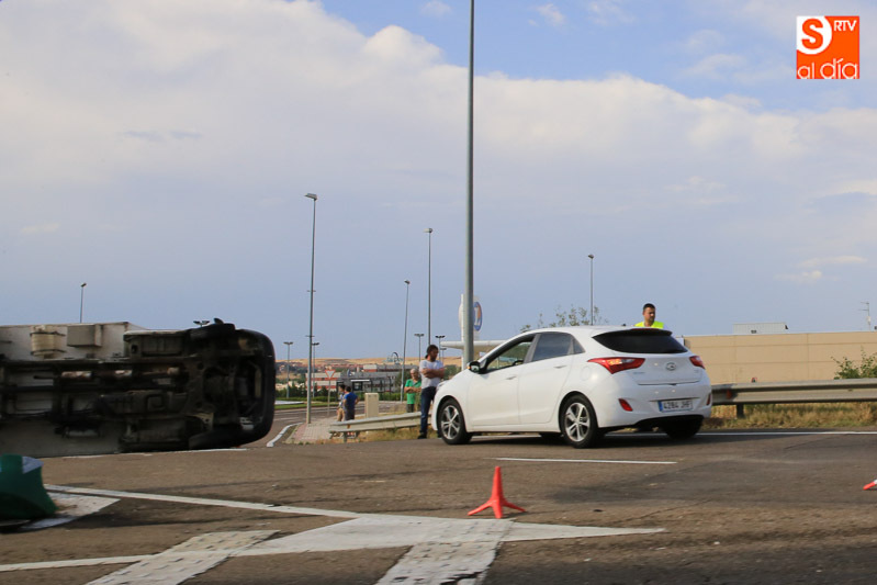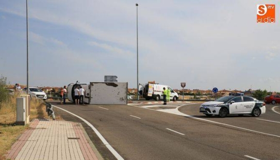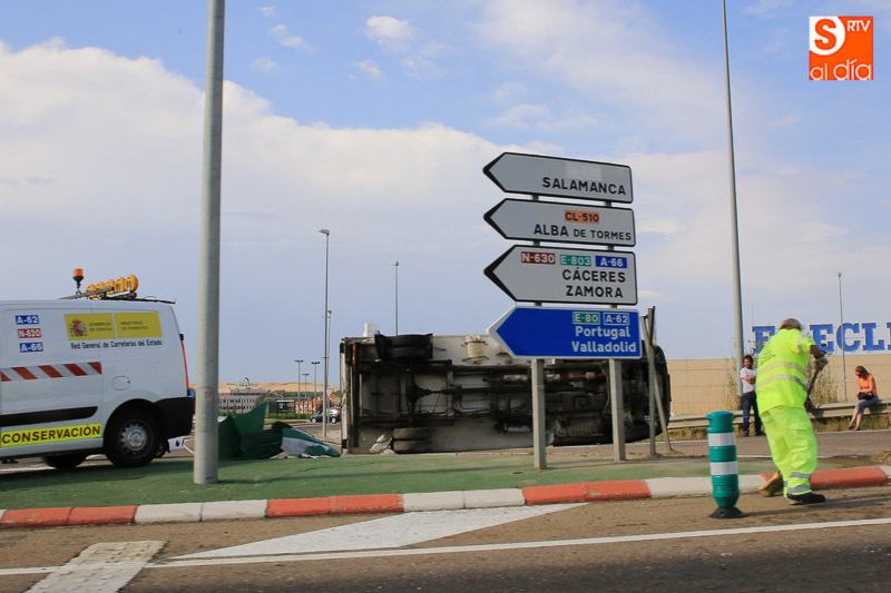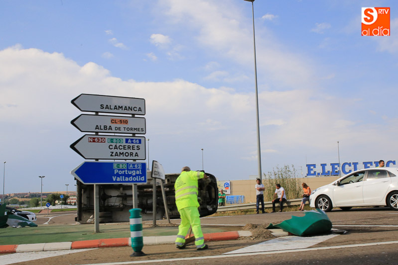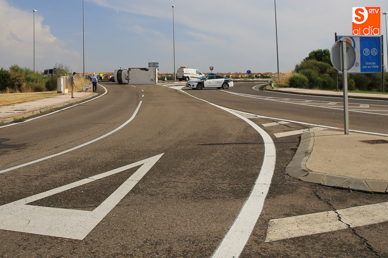La fuerte tormenta de lluvia y granizo ha provocado varios accidentes de tráfico en la capital y en los alrededores, siendo el más aparatoso el registrado sobre las seis de la tarde en la rotonda de E. Leclerc al volcar un camión sobre la calzada. El vehículo pesado ha quedado volcado en la rotonda, obligando a cortar el tráfico de acceso y salida al hipermercado. Hasta el lugar del suceso se ha desplazado un vehículo de la Guardia Civil para controlar la circulación.