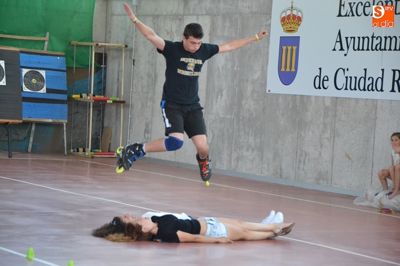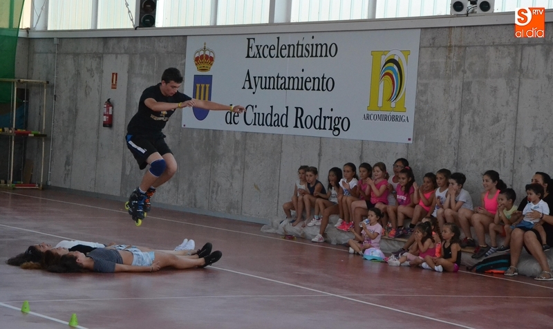 CIUDAD RODRIGO | Varias de las integrantes de la Escuela se tumbaron en el suelo para ser saltadas por uno de los patinadores, Rubén Garduño