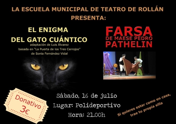 Por segundo año consecutivo, la Escuela Municipal de Teatro de Rollán hará pasar al público una noche diferente, poniendo en escena dos obra de teatro El Enigma del gato cuántico y Farsa de Maese Pedro Pathelin. Será el próximo sábado, día 16, a las 21 horas en el Polideportivo.