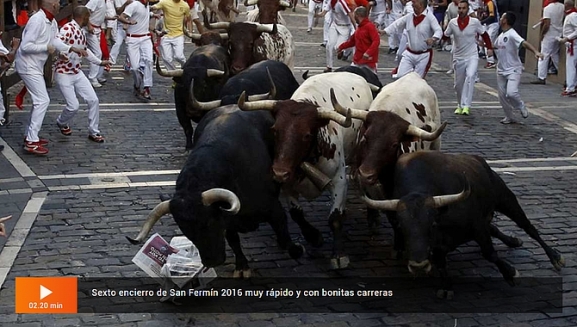 Precioso y superrápido encierro de San Fermín celebrado este martes en Pamplona con motivo de las fiestas de San Fermín. Se corrieron seis toros de la ganadería de Victoriano del Río, cuatro morlacos de capa negra, un castaño y un burraco, que realizaron el recorrido en dos minutos y 13 segundos, y en el primer avance ofrecido por Cruz Roja únicamente se contabilizaron dos heridos por contusiones trasladados al complejo hospitalario de Pamplona. Posteriormente,esta cifra aumentaba a cuatro heridos.