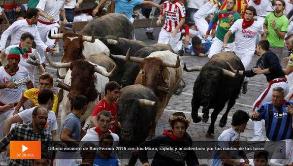 Rápido y emocionante encierro de Miura con cinco toros cárdenos y un colorado, que realizaron el recorrido en dos minutos y veinte segundo, y que apenas hubiera sobrepasado los dos minutos de no producirse el incidente descrito a la entrada del ruedo. El avance del parte médico ofrecido por Cruz Roja registra varios heridos trasladados al complejo hospitalario por contusiones y una herida en una ceja del corredor que estuvo a punto de ser corneado en la plaza.