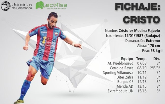 El futbolista pacense Cristofer Medina Pajuelo, conocido como Cristo, será jugador de Unionistas de Salamanca CF las dos próximas temporadas. El jugador, séptimo fichaje del club para el estreno en Tercera División, es un atacante que suele jugar como extremo en ambas bandas.