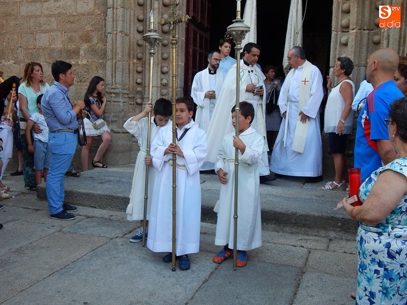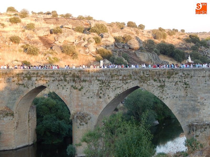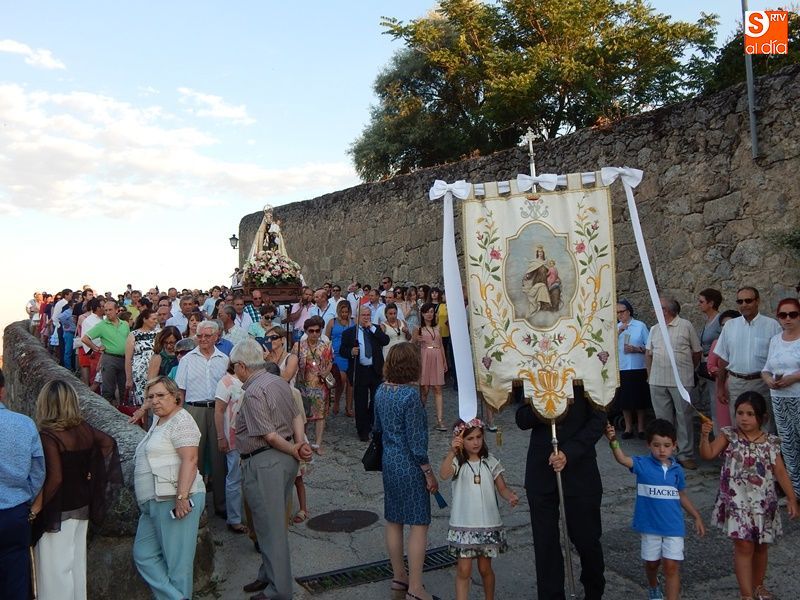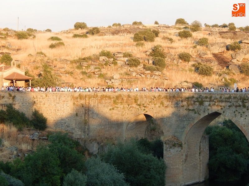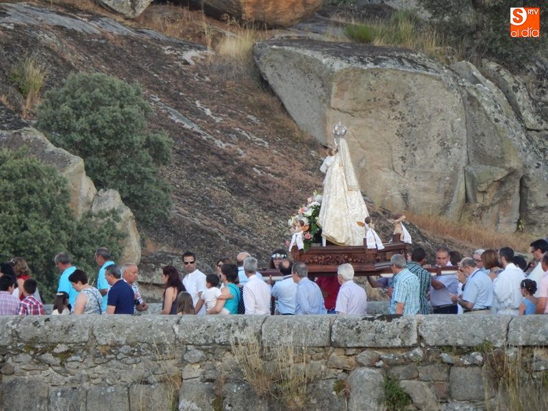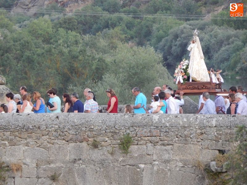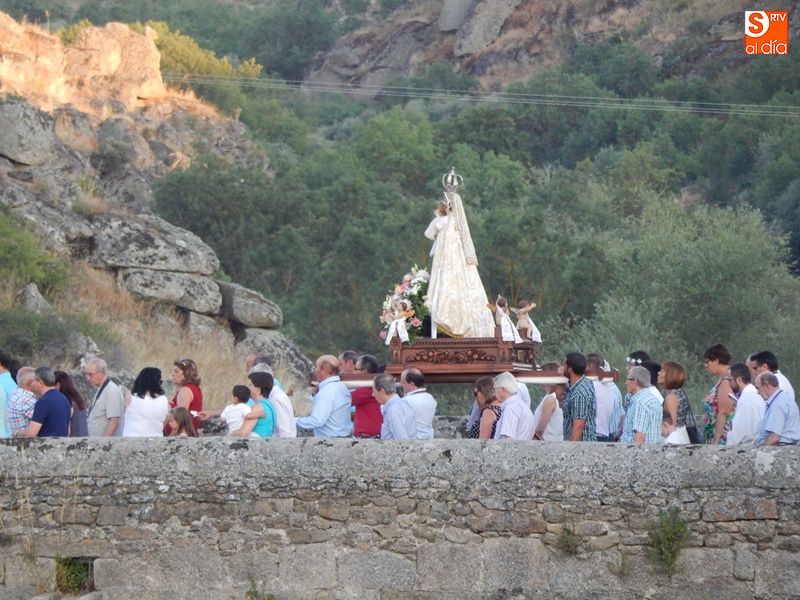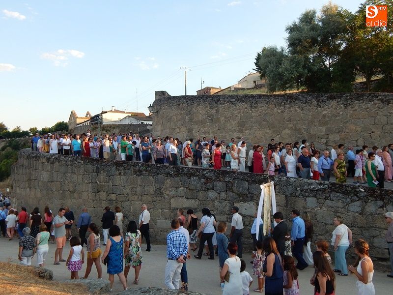 Concurrida y solemne bajada de la Virgen del Carmen en el regreso a su ermita al otro lado del puente. Más de un millar de fieles y devotos han querido acompañar en procesión a la imagen de la patrona de Ledesma, desde su salida del templo de Santa María La Mayor donde ha permanecido desde la pasada semana para la celebración del tradicional novenario. Al tañir de las campanas, las puertas de la iglesia se han abierto para dejar paso a la venerada imagen.