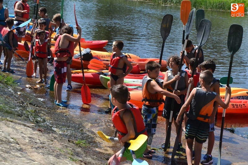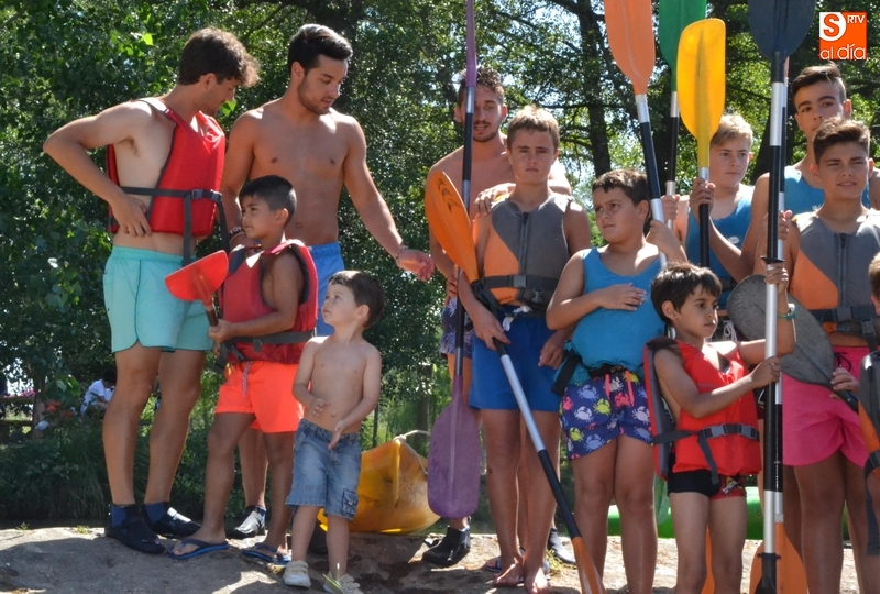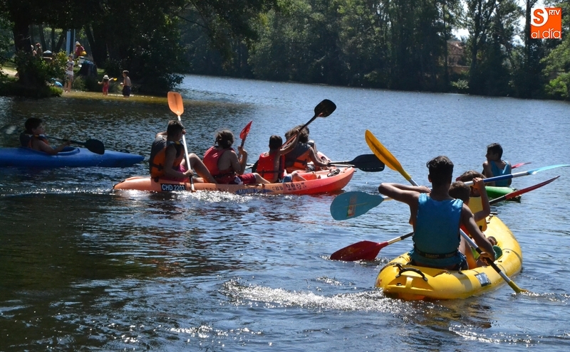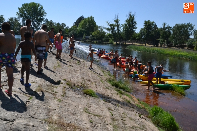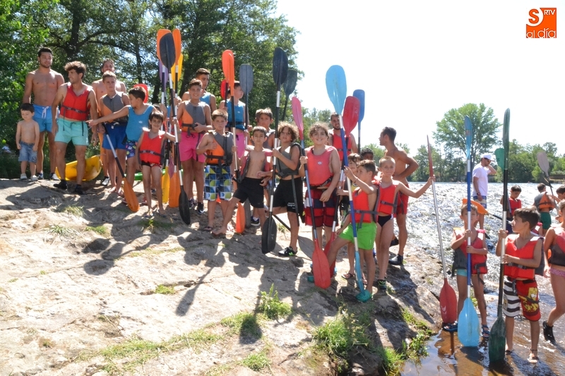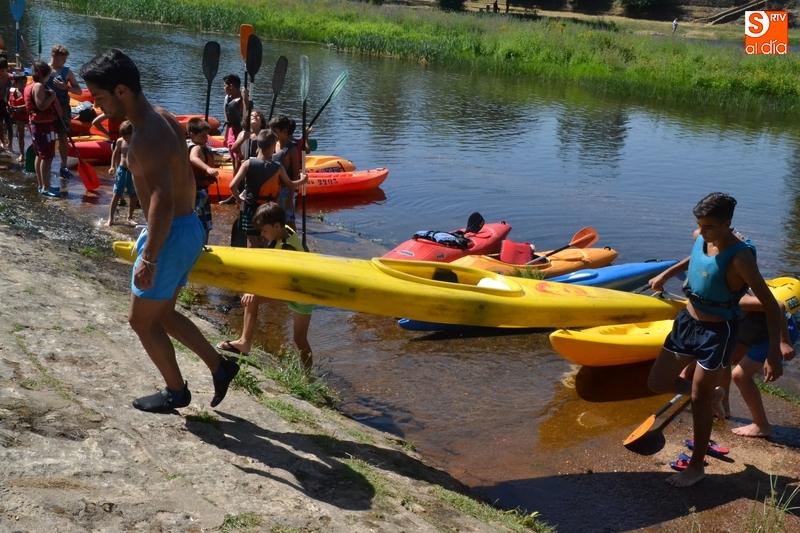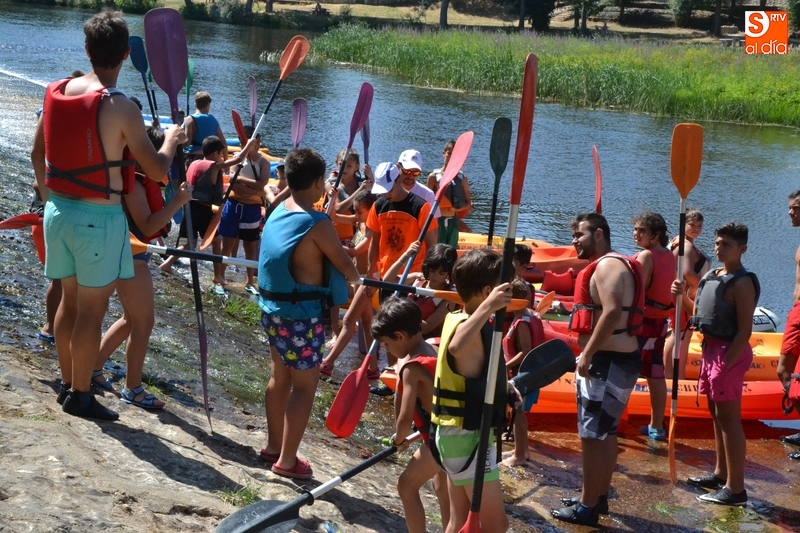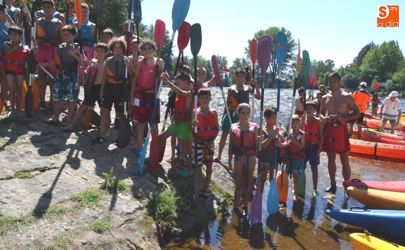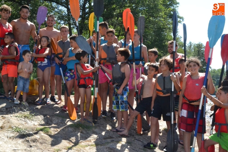 Los participantes en el Miróbriga Campus promovido por los jugadores del Ciudad Rodrigo CF Gabri de Aller y David Risueño, y en el Campus de Verano de Pádel Miróbriga coincidieron en la mañana del miércoles en las aguas del río Águeda, para realizar una ruta en piragua de la mano de la empresa Descensos Medina.