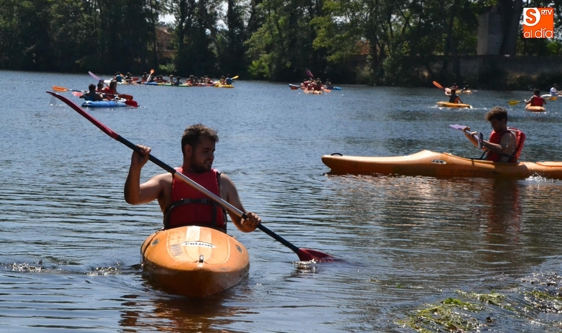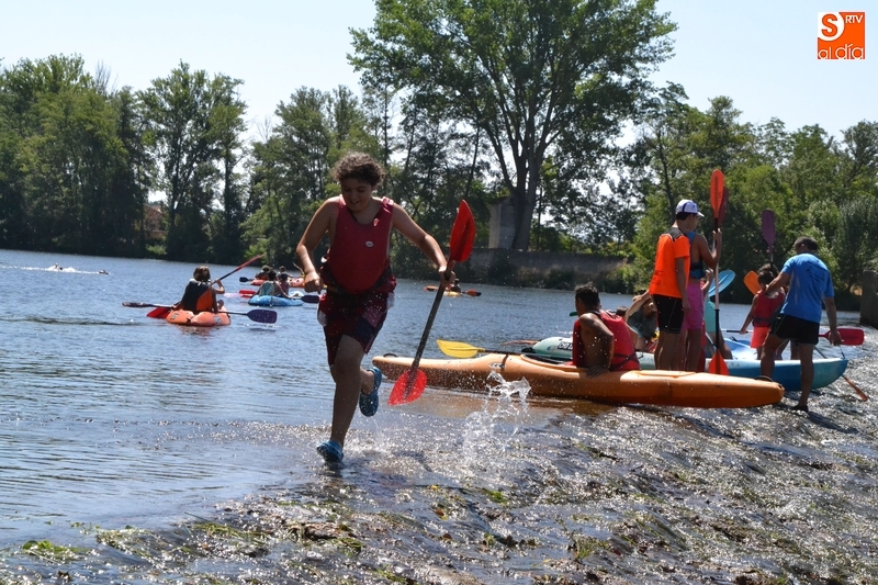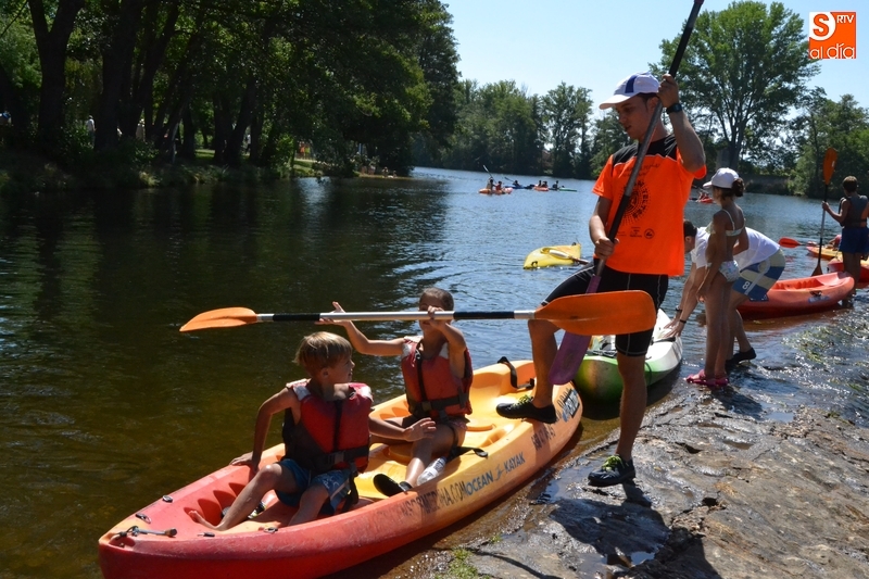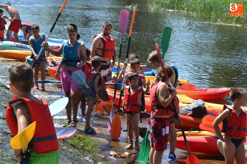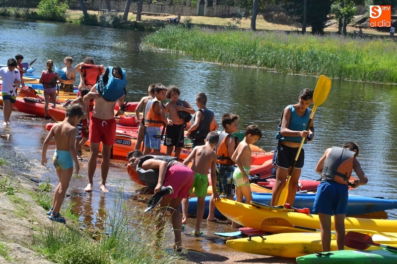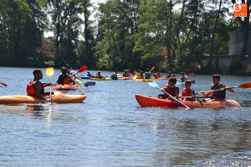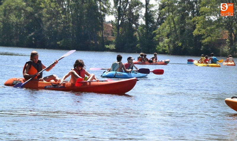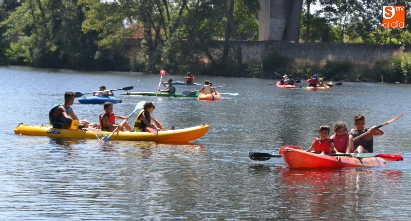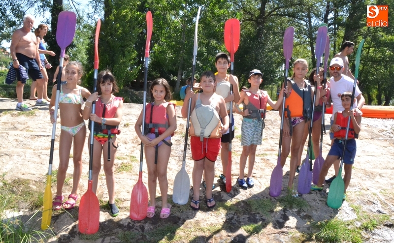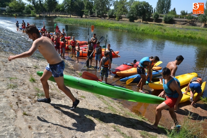 Los participantes en el Miróbriga Campus promovido por los jugadores del Ciudad Rodrigo CF Gabri de Aller y David Risueño, y en el Campus de Verano de Pádel Miróbriga coincidieron en la mañana del miércoles en las aguas del río Águeda, para realizar una ruta en piragua de la mano de la empresa Descensos Medina.