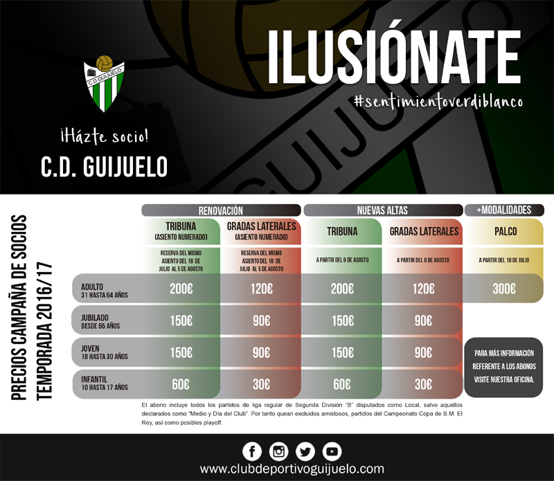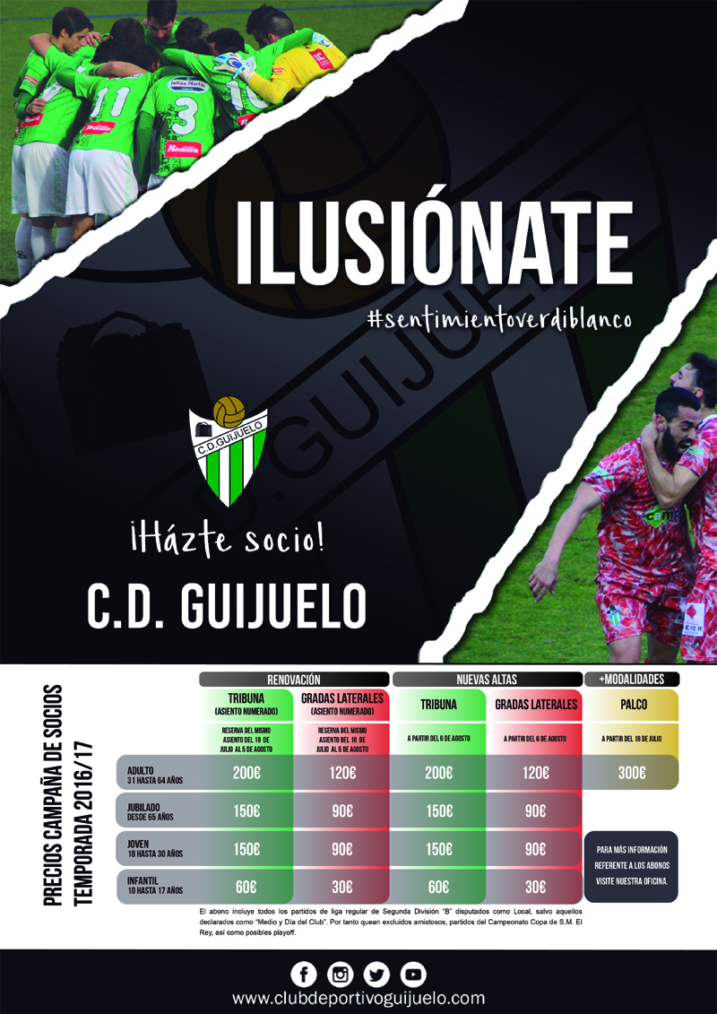 El Club Deportivo Guijuelo presentó esta mañana la campaña de captación de socios para la presente temporada, en la que se mantienen los precios del pasado año. Con el eslogan "Ilusiónate", invitan a emocionarse en el Municipal con una nueva temporada en Segunda División B, además promueven el hashtag para redes sociales #sentimientoverdiblanco.
