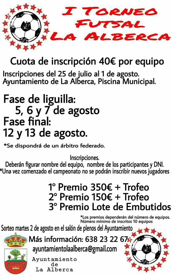 El Ayuntamiento de la localidad serrana apuesta por el deporte en verano con la celebración del I Torneo Futsal La Alberca. El campeonato constará de dos partes, la primera será una liguilla, que se disputará los días 5, 6 y 7 de agosto. La fase final se celebrará el 12 y 13 de agosto con la presencia de un árbitro federado. El sorteo de equipos se celebrará el martes 2 de agosto en el salón de plenos del Consistorio.