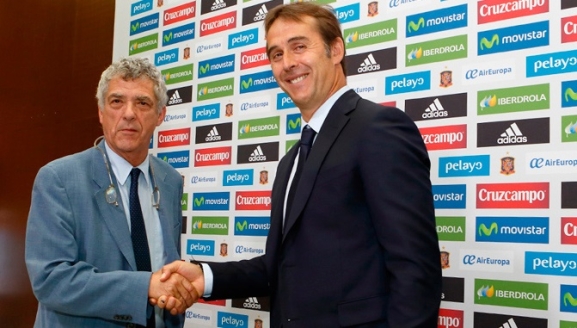 Durante su presentación, ha tenido palabras de agradecimiento para su predecesor: «Con Vicente no tuve la oportunidad de hablar pero seguro que hablaré. Tengo una relación magnifica. Él ha hecho un trabajo ejemplar con la selección», recordó. Junto a Lopetegui llegarán dos hombres de su máxima confianza. El resto del cuerpo técnico estará formado por trabajadores que ya estaban en la Federación Española de Fútbol (FEF) y a los que ya conocía de su etapa en las categorías inferiores.