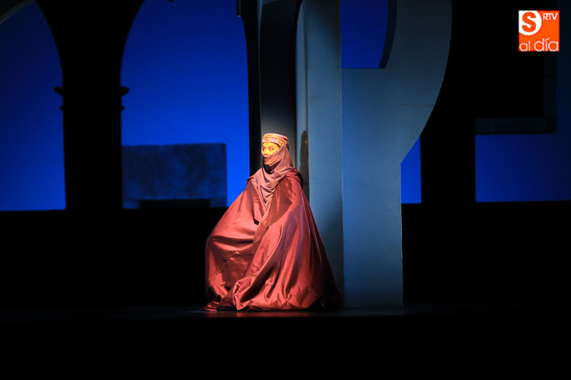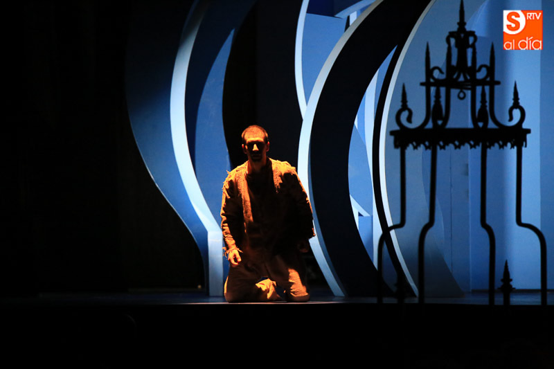 Una Bailarina mima algunas de las acciones que acontecen en la narración y nos sumergen en aquel apasionante siglo XVI en el que Cervantes vivió. Poco antes del final del relato de Cervantes a La Dama se nos descubre que la confusión y el delirio de don Miguel han recreado la figura de la supuesta Dama que no es otra que la de su liberador. Sus delirios han creado en su cerebro el germen de las futuras novelas ejemplares que años después desarrollará plenamente. La atmósfera escénica, plagada de claroscuros, de siluetas adivinadas, de imágenes que se filtran a través de unos inmensos barrotes llenando, a veces, la escena de hermosas abstracciones proyectadas crean una ilusión mágica, una sensación de irrealidad, el marco perfecto en el que lo imposible puede llegar a ser verdad. Un marco en el que la imaginación alucinada de un genio puede avanzar historias que más adelante, sin sosiego, vencido por tantas cosas, escribirá de manera magistral.