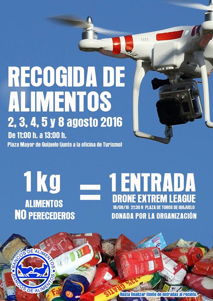 La Drone Extrem League, que se enmarca dentro de la programación preparada por la Concejalía de Festejos para las fiesta patronales, tiene carácter gratuito (hasta finalizar el límite de aforo del recinto) aunque por primera vez se va a asociar la entrada a la participación popular en la 'operación kilo' que se desarrollará desde la delegación salmantina del Banco de Alimentos.