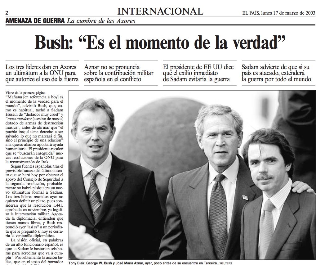 ¿Por qué era una amenaza el Irak de Sadam y en que ha mejorado la situación tras la invasión? ¿En qué situación nos encontramos pasados trece años? Estas, y otras preguntas que nos hicimos antes y ahora, no fueron respondidas por sus responsables. Ahora cuando, vemos las consecuencias, y comienzan a avergonzarse los estadounidenses, cuando afloran informes y documentación vuelven a salir a flote las fotografías con las torturas llevadas a cabo en prisiones como Abu Ghraib provocando oleadas de antiamericanismo, en todo el mundo, como ha tenido que presenciar el saliente presidente Obama. Y que sin duda su poderoso país tendrá que seguir respondiendo de esta acusación?Tal y como ya se empiezan a cuestionar los británicos, donde por tercera vez su primer ministro Blair, avergonzado, abrumado, arrepentido y rendido, pide perdón allá por donde le llevan sus vacilantes pasos y en cada oportunidad que se le presenta, evidentemente parece ser el menos arrogante, jactancioso, e inteligente de los tres "medallas" de las Azores. Y además, sabe muy bien que tarde o temprano, se formara una comisión, que definitivamente le pida las razones y los papeles, de engaño manifiesto a su congreso y a sus ciudadanos ocultando la verdad, por la que le costó cerca de mil muertos. Tanto Blair como el arrogante y áspero Aznar, estaban convencidos de que había que hacer uso de la fuerza militar apoyando a difundir los "valores americanos" y luchar contra el mal desde un punto de vista enérgicamente cristiano. Y pensaban que estando a su lado, no debían dejarse agobiar por informadores, aliados tratados y organizaciones internacionales. Ellos, no necesitaban a nadie. Puede, que los soldados prefiriesen la diplomacia; los hombres de negocios metidos en política la guerra.