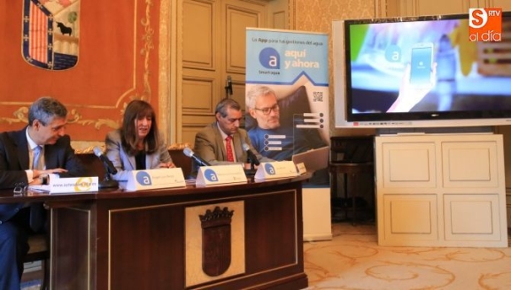 La concejala de Medio Ambiente, María José Fresnadillo, junto al director regional de Aqualia, Ángel Luis Pérez, y el jefe de departamento de Gestión de Clientes de Salamanca, Luis Romo, han presentado Smart Aqua, la nueva aplicación gratuita para dispositivos móviles, Android e IOS, que permite realizar todas las gestiones relacionadas con el contrato del agua y se convierte en un canal de comunicación más al servicio de los salmantinos. Smart Aqua posibilita efectuar todas las gestiones en el momento en el que la persona quiera - las 24 horas de los 365 días de año- de forma sencilla y cómoda.