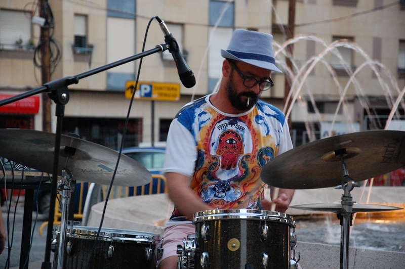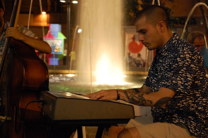 La noche, cálida, feliz, llena de gente, niños, perros, calma y hasta una fuente que pon e la música de fondo, y una plaza viva que nos da lecciones de vecindad, de cultura colectiva. ALAMISA, siempre atenta a colaborar y llevar la música improvisada a todos los rincones, se ha aliado con la Asociación ZOES y con La Salchichería, Café Bar Bonanza y MT para llevar el jazz a este rincón de Salamanca lleno de alegría. Una noche cálida para escuchar a un pianista excepcional, Luismi Segurado, secundado por un contrabajo siempre presente, el de Chuchi García y una batería bien conocida por todos los amantes salmantinos de jazz, Juanma Barroso. Músicos no solo solventes, excepcionales, a pie de calle, cercanos al público, en pantalón corto, con la etiqueta veraniega de un concierto especial de calor y color de estío.
