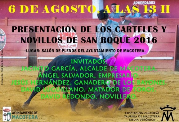 La Asociación Cultural Taurina Media Verónica de Macotera presentará el próximo sábado los carteles de las fiestas de San Roque 2016 de la localidad.