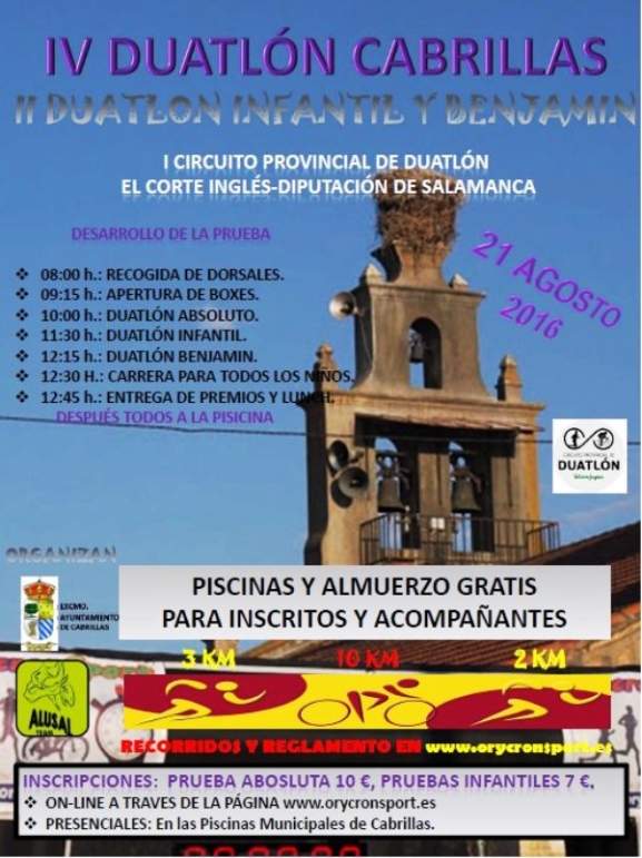 El próximo 21 de agosto, a partir de las 10 horas, la localidad de Cabrillas acogerá el IV Duatlón del municipio, aunque será el primero dentro del I Circuito Provincial El Corte Inglés-Diputación de Salamanca y