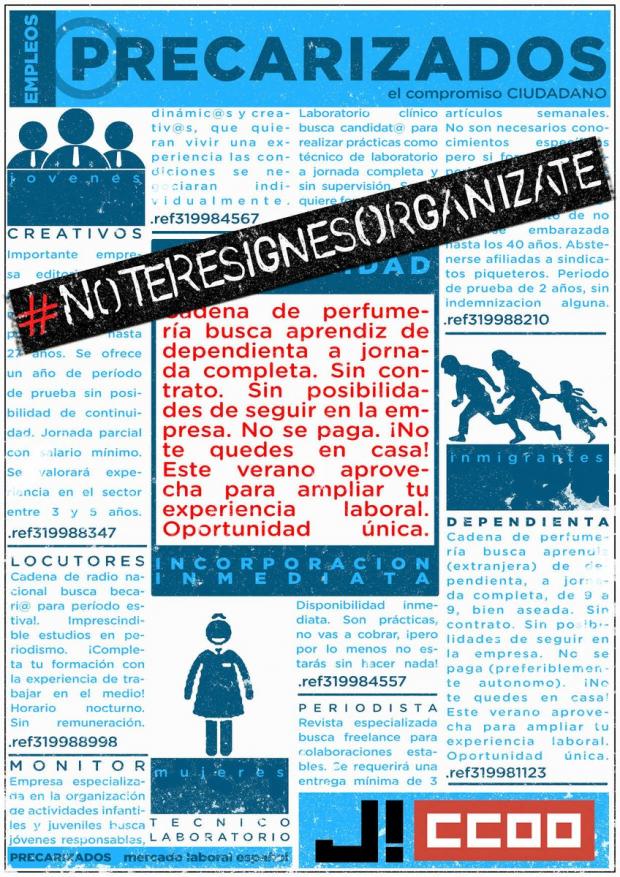 Para llamar la atención sobre estos fenómenos, y con el fin de combatir la resignación en torno a ellos, Jóvenes CCOO ha puesto en marcha una campaña de difusión en Twitter y en Facebook, bajo el hashtag #NoTeResignesOrganízate, que además pretende animar a la juventud que padece estas situaciones de precariedad a que se una y se organice sindicalmente para defender sus derechos.