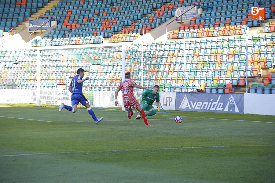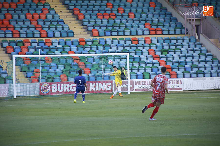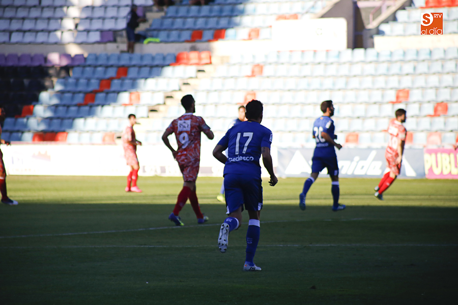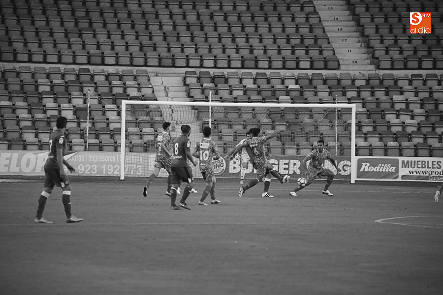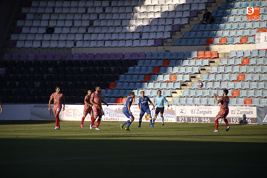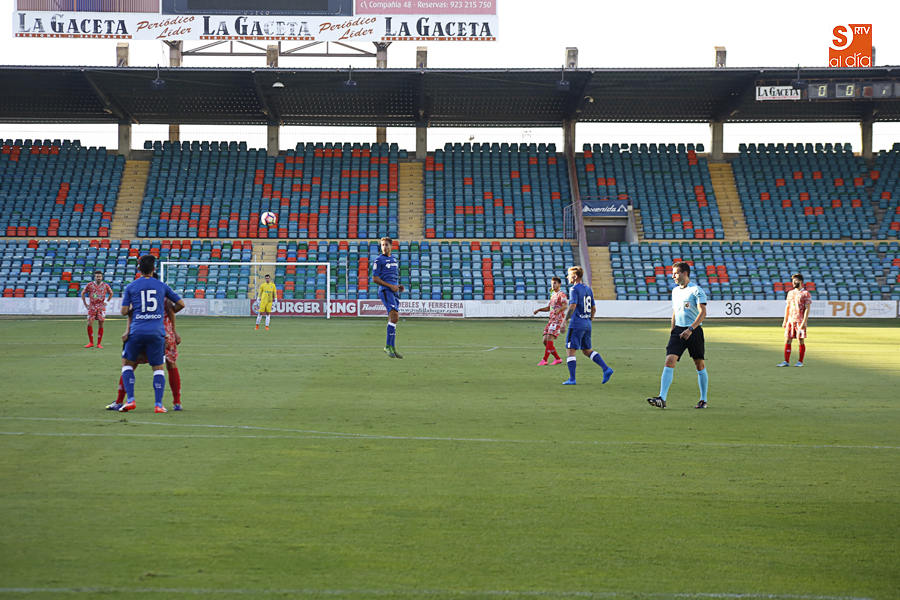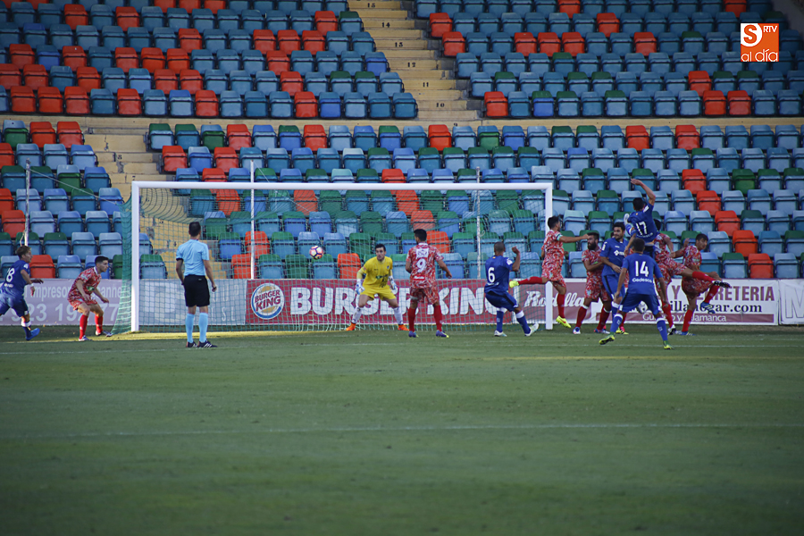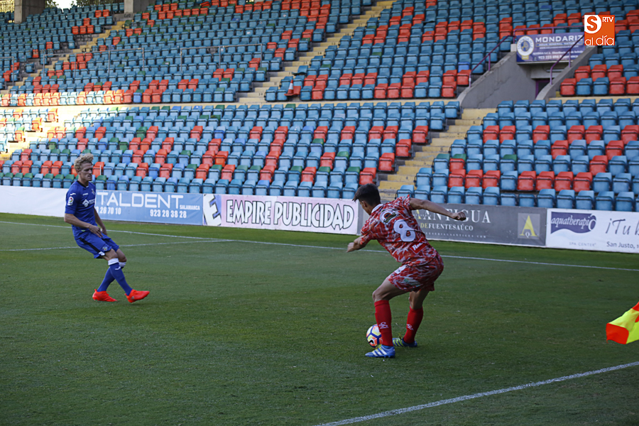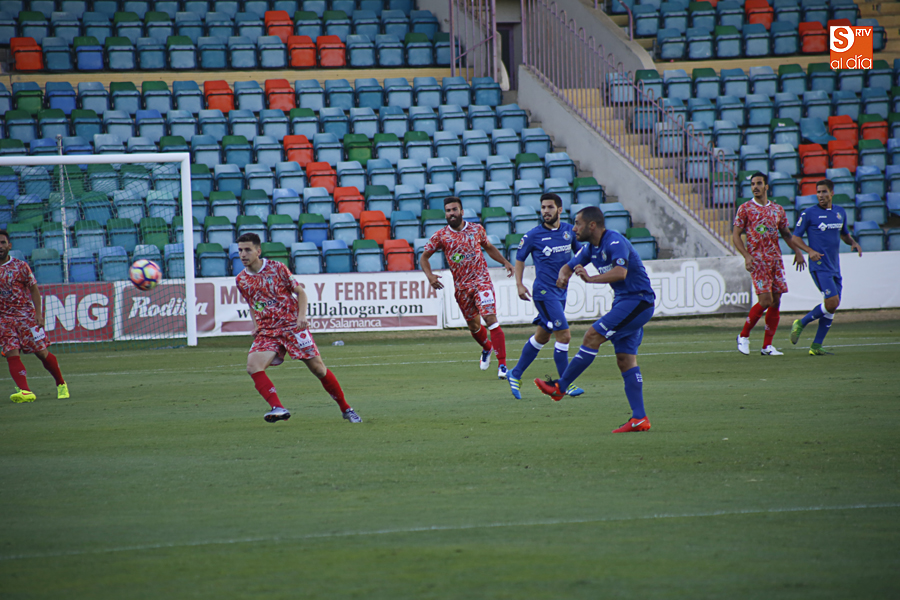 Tras comenzar el partido, el interés para el reducido público fue creciendo con dos equipos que querían la pelota para demostrar su buen juego. El primer susto de importancia para el Guijuelo, y también el primer triunfo, fue un penalti a favor de los madrileños que detuvo el guardameta verdiblanco. El lance de juego ocurrió en el minuto 15, el árbitro señaló pena máxima a favor del Getafe, que se encargó de lanzar Jorge Molina. Kike Royo detuvo el disparo, manteniendo el marcador con el empate a cero original. Por su parte, el Guijuelo tuvo su primera oportunidad con una internada de Néstor que envió el balón a Dimas en buena posición, pero que no pudo concluir la jugada. A partir de ese momento se vivieron los mejores minutos del Guijuelo, justo hasta la recta final, en la que el Getafe volvió a amenazar con abrir el marcador. En esta ocasión Cata logró marcar, pero el gol fue anulado por el colegiado.