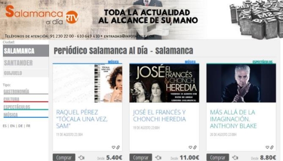 Los lectores, y en general los salmantinos, pueden acceder a los principales conciertos y actividades culturales de la ciudad y provincia a través de nuestro periódico. SALAMANCArtv AL DÍA. Tanto en la "home" de su digital como en el periódico gratuito (35.000 ejemplares) existe un enlace donde poder comprar las entradas de los últimos eventos teatrales, musicales, gastronómicos, turísticos de Salamanca y provincia, un gran avance en la comodidad de los usuarios.