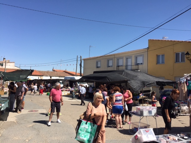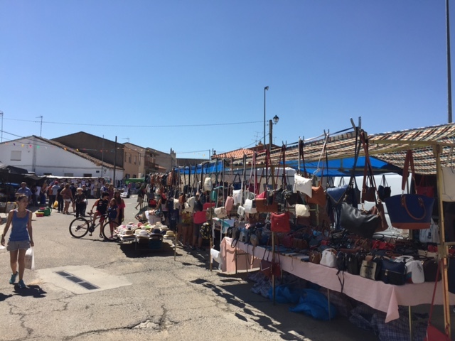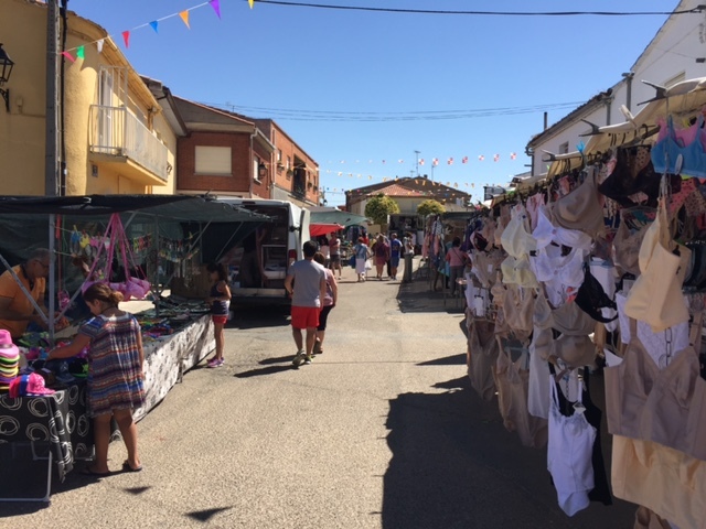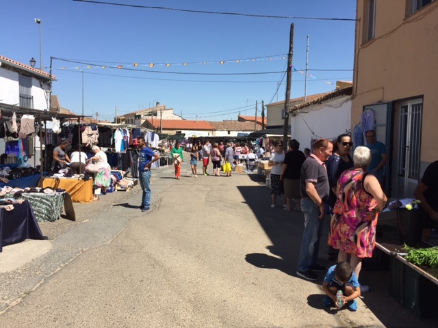 Las últimas compras y el encuentro entre vecinos y visitantes han marcado la mañana en el mercadillo, rodeado también por los primeros puestos de hinchables para los niños.