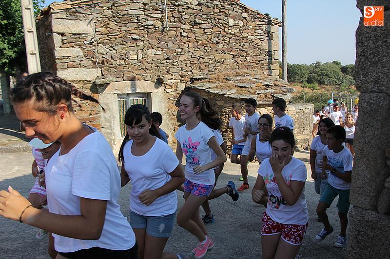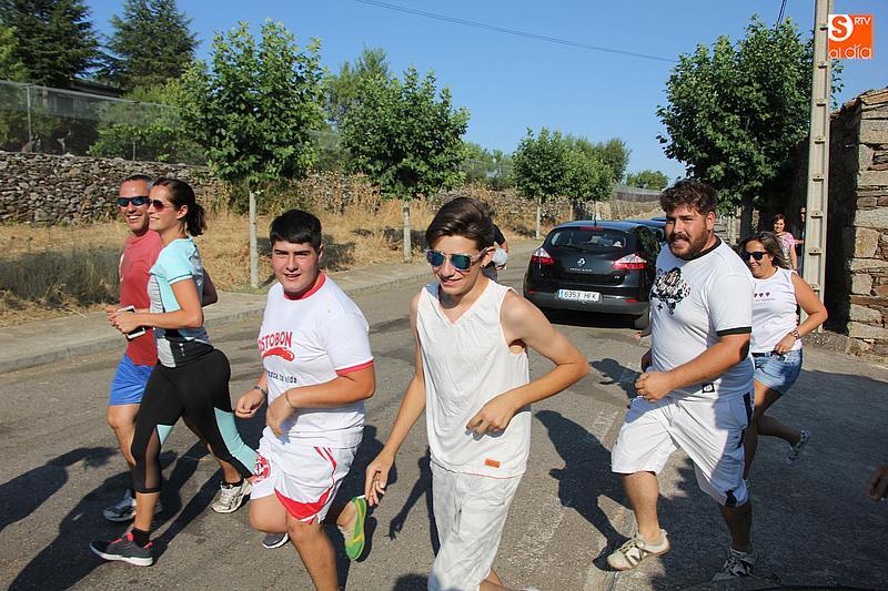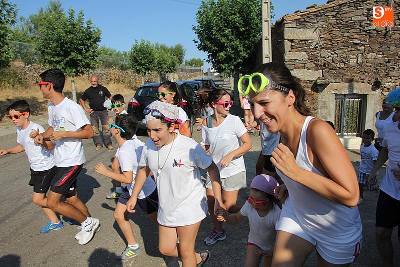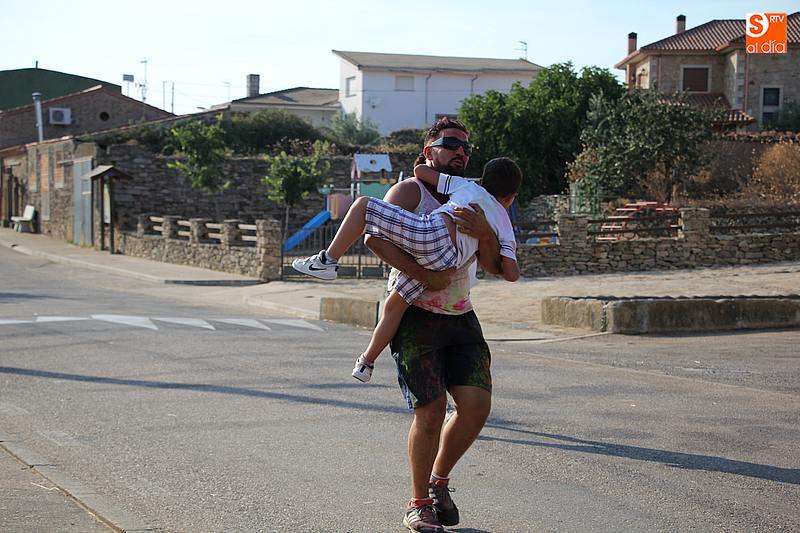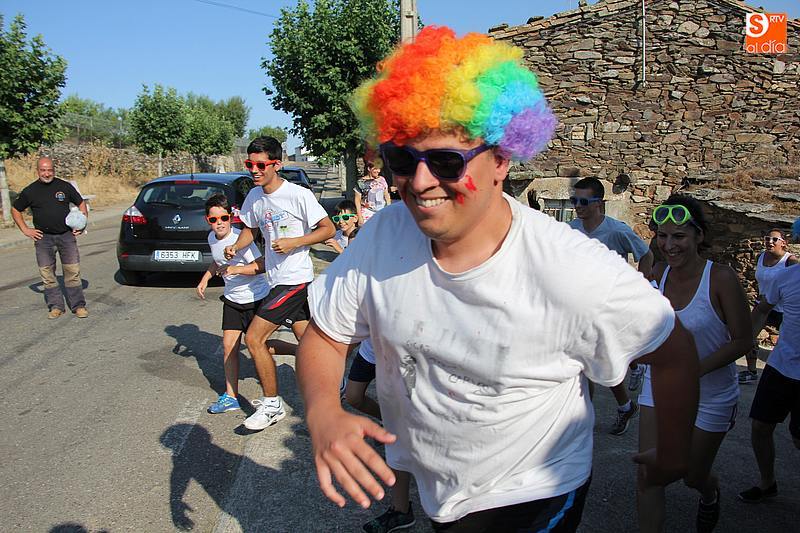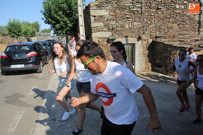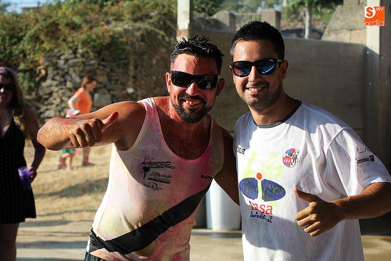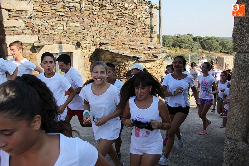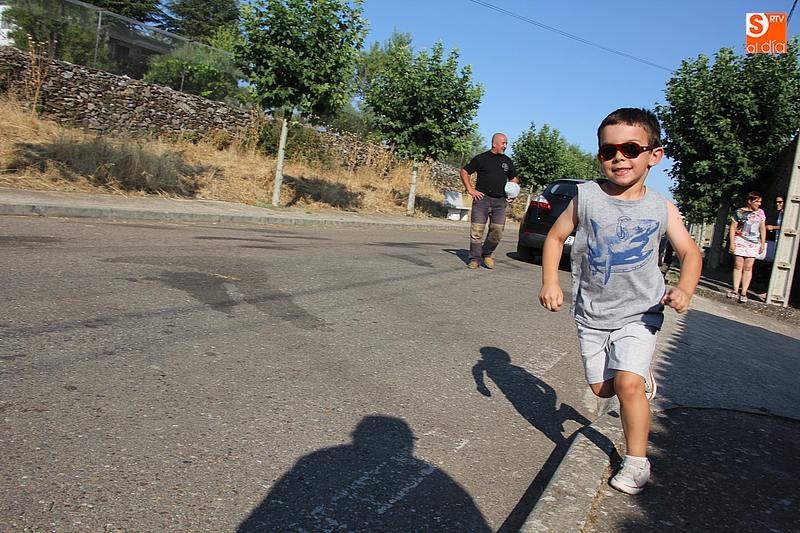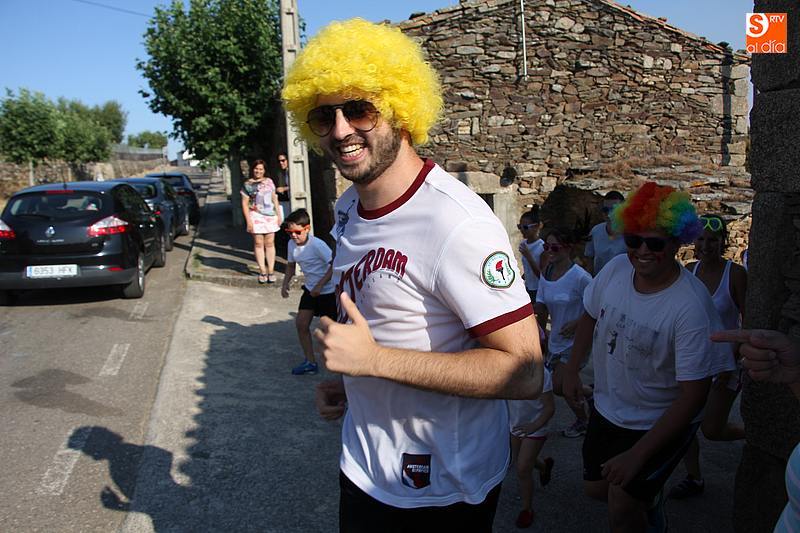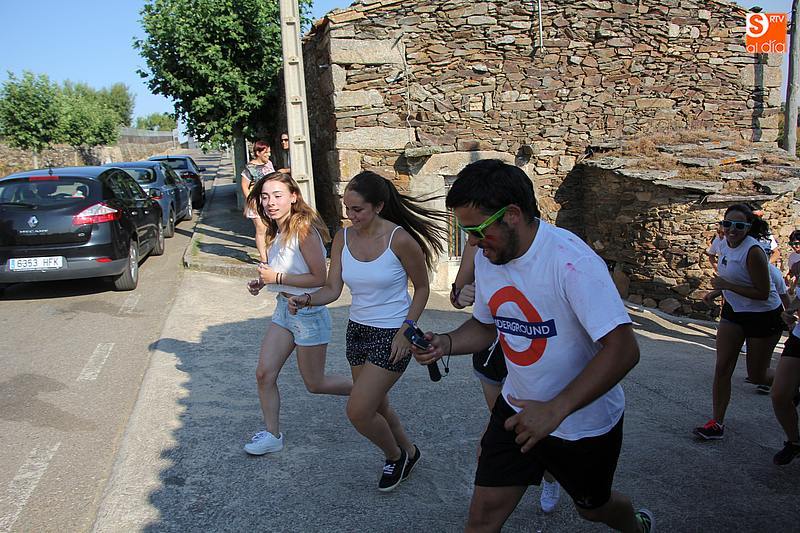 Después del preámbulo en la noche antes con actividades terroríficas para los niños y la concentración de peñas para calentar motores, las fiestas de Bermellar en honor a Nuestra Señora de la Peña de Francia continuaban este viernes pasadas las seis y media de la tarde con una carrera urbana y lanzamiento de colores, una actividad que tuvo como aliciente añadido para los más pequeños los chapuzones con la manguera en la trasera de las escuelas.