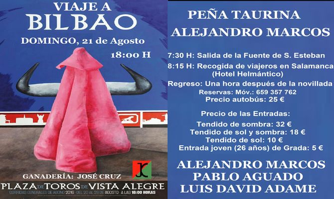La Peña Taurina Alejandro Marcos ha programado un viaje en autobús a Bilbao para ver la novillada en la que torean Alejandro Marcos, Pablo Aguado y Luis David Adame con novillos de la ganadería de José Cruz. Será el próximo 21 de agosto y dará comienzo a las 18:00 horas.
