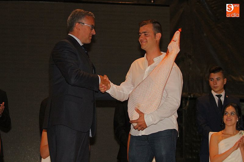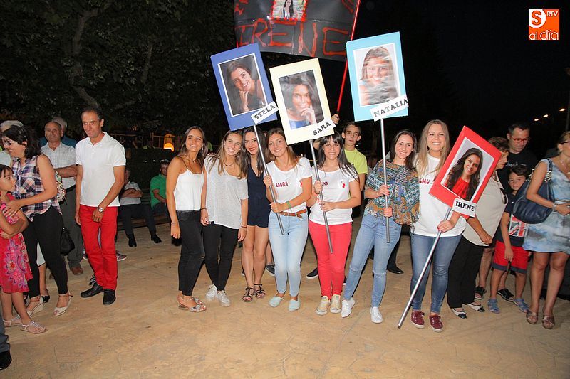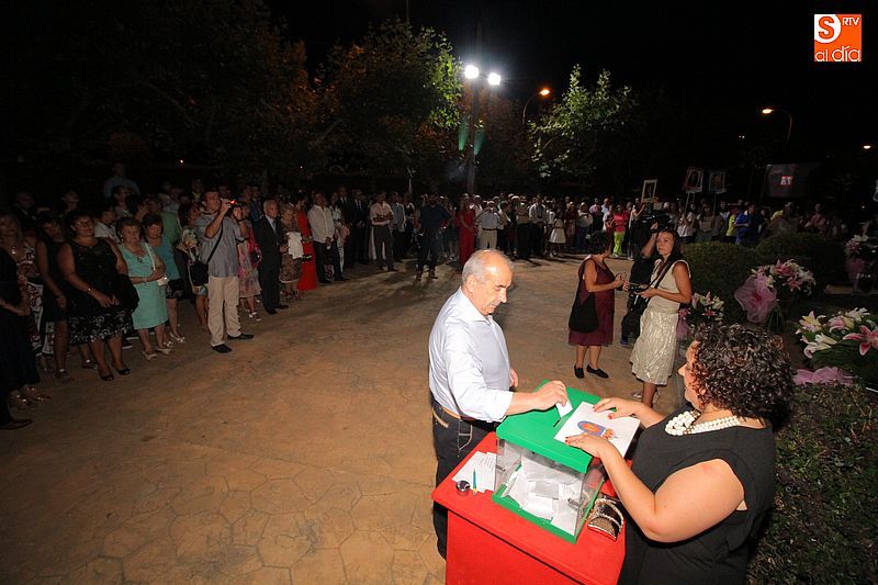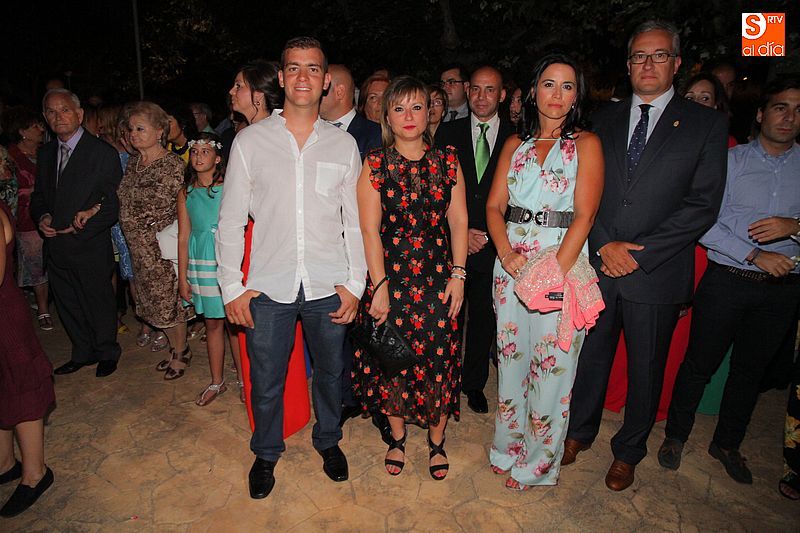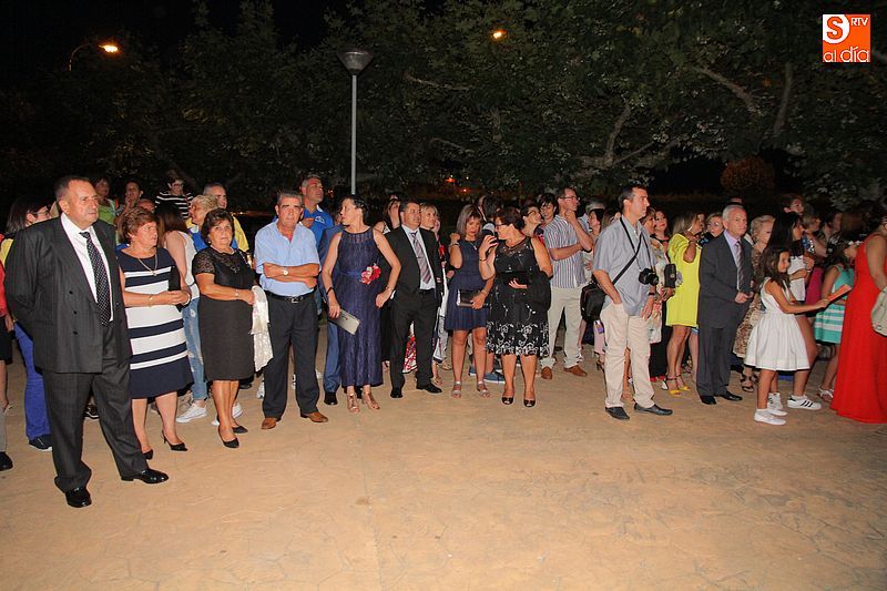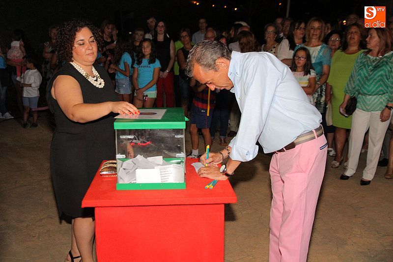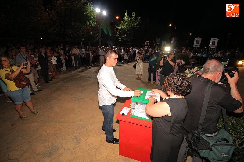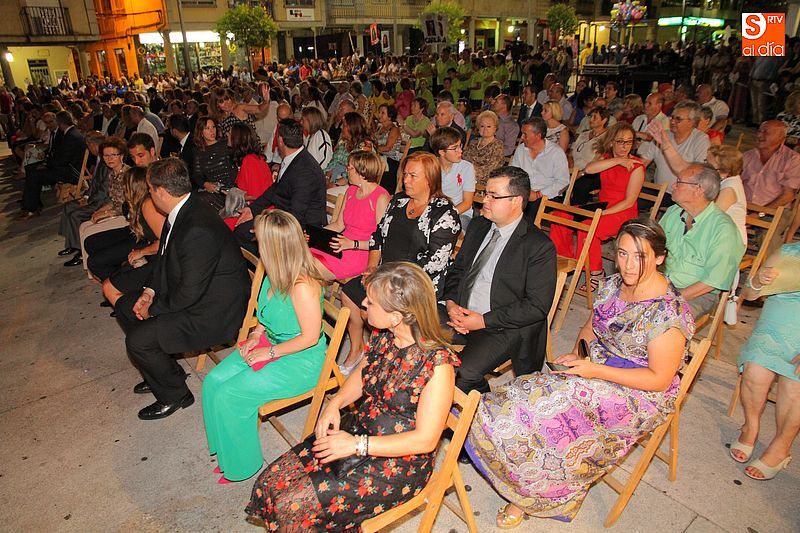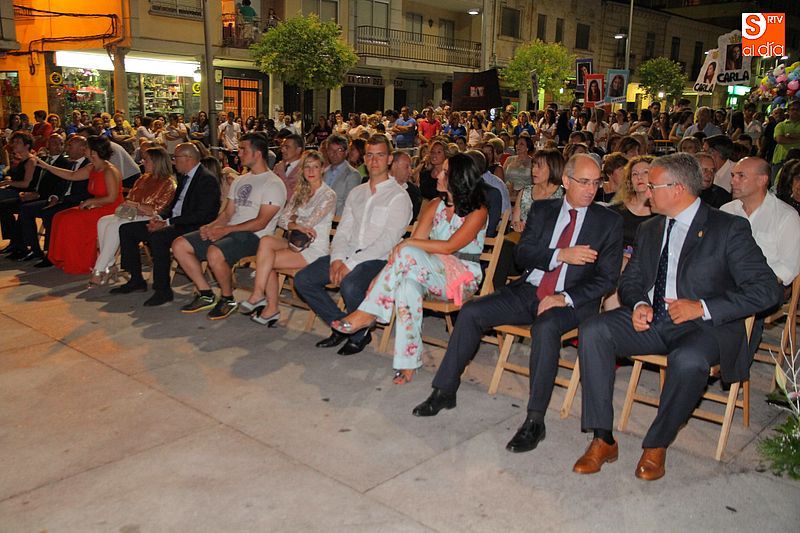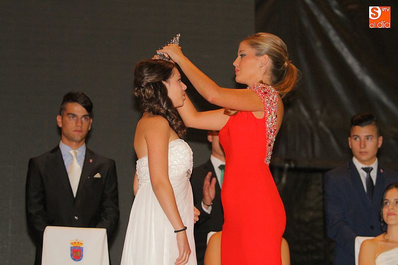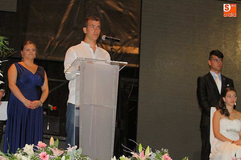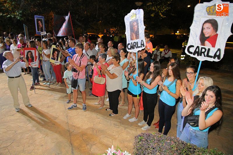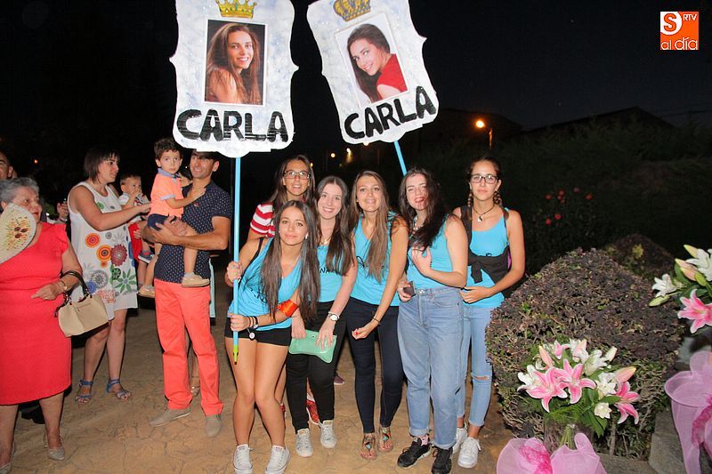 Las fiestas de Guijuelo viven la noche más mágica de la programación con la tradicional elección de la Reina de las Fiestas. Tras el vibrante chupinazo por la tarde, se presentó a la corte de honor, formada por Carla Andrés Peña, Estela Aparicio Velázquez, Sara Berrocal García, Natalia Díaz Calvo e Irene Gómez Luis y sus acompañantes, en el parque de El Pozuelo, con la presencia de la Corporación Municipal al completo, incluyendo al alcalde, Julián Ramos, y la presencia del presidente de la Diputación de Salamanca, Javier Iglesias. En ese escenario votaron los representantes de lasasociaciones culturales y deportivas de la villa, cuyos votos se sumaron a los que las peñas han realizado durante los pasados días en la oficina de turismo. Tras el acto protocolario, se ha desfilado hasta la plaza Mayor, donde ha llegado el turno de Lorenzo Santolino como pregonero de las fiestas. En su discurso ha recordado y agradecido el apoyo recibido por los vecinos de la villa en su trayectoria como piloto de Enduro y cómo ha llevado el jamón de Guijuelo como bandera por todo el mundo una vez en el campeonato mundial. Tras las palabras de Santolino, el juez de paz, José Conde, entregó el resultado de la votación, desvelándose el nombre de Carla Andrés como Reina de las Fiestas 2016, la reina de 2015, Isabel Benito, coronó a Carla, quien a su vez impuso las bandas a sus compañeras, cerrándose el acto con el tradicional vals de manos del alcalde.