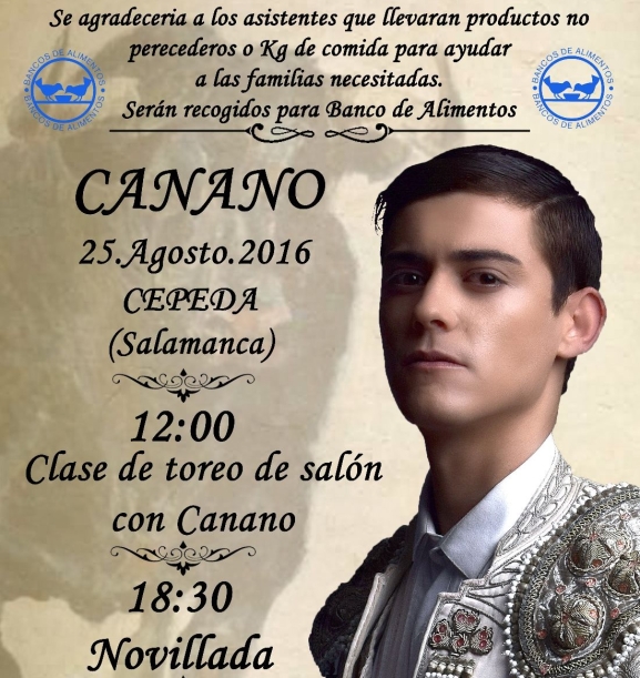 El novillero Christian Canano matará una novillada en solitario de la ganadería Manolo Gimeno a beneficio de Banco de Alimentos en Cepeda de la Sierra (Salamanca), donde intentará recaudar una gran cantidad de alimentos no perecederos junto al Ayuntamiento y la Peña del Toro de Cepeda para ayudar a las familias más necesitadas.