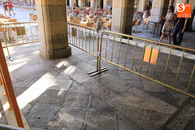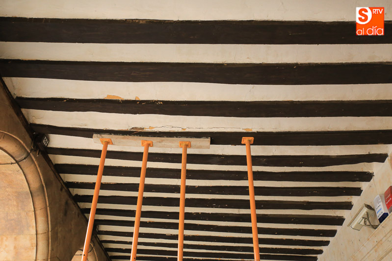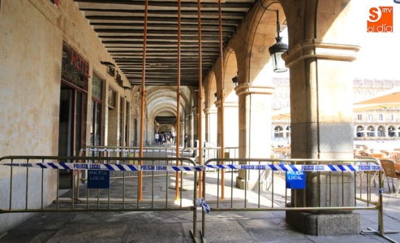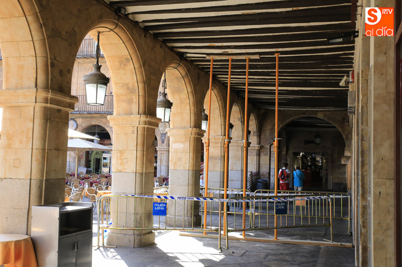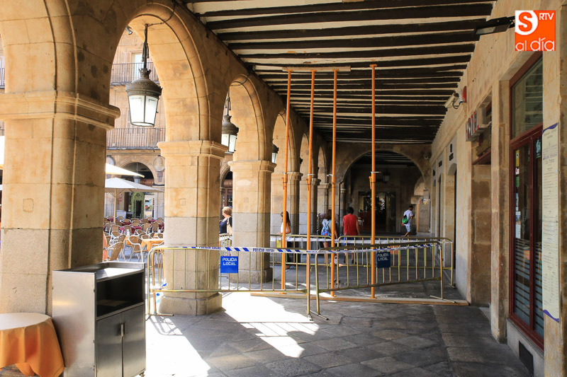 El Ayuntamiento de Salamanca ha apuntalado de manera preventiva una viga que ha cedido esta mañana en los soportales de la Plaza Mayor y ha procedido al vallado de seguridad de la zona afectada. Concretamente, la viga está situada entre la cafetería Las Torres y la joyería Torrico.