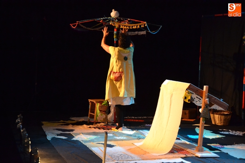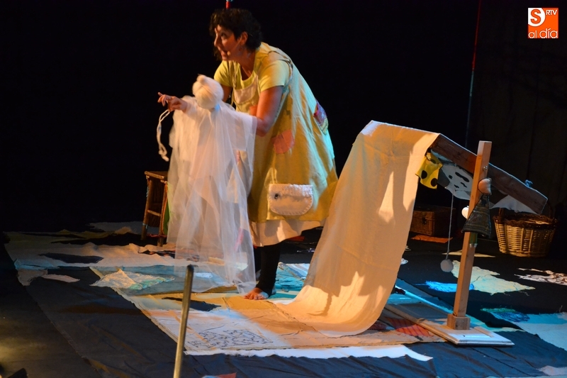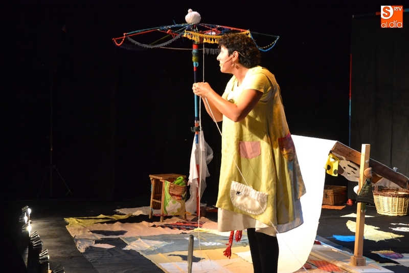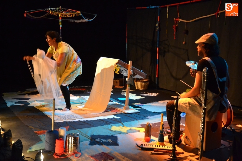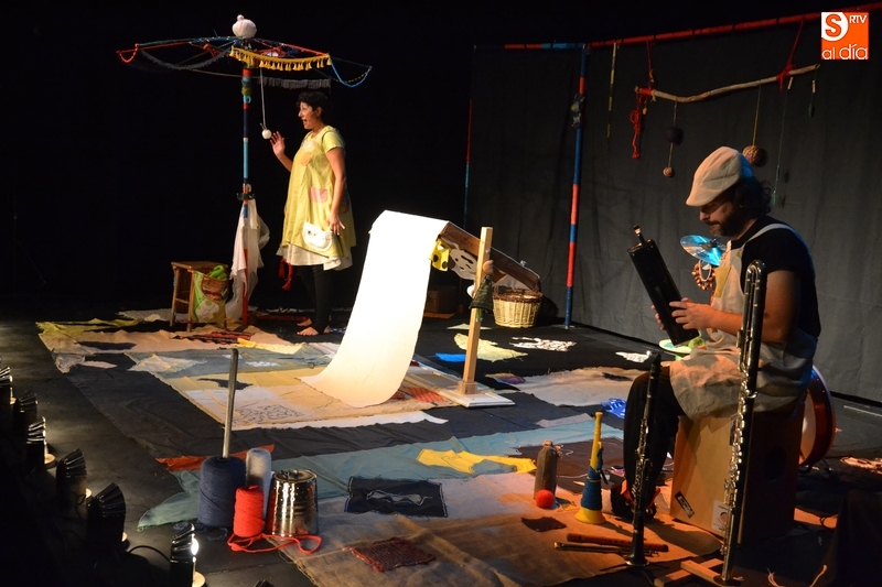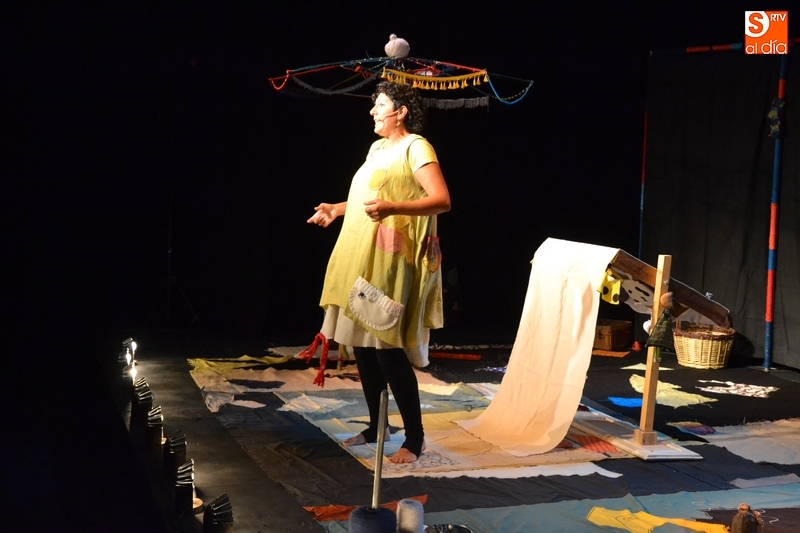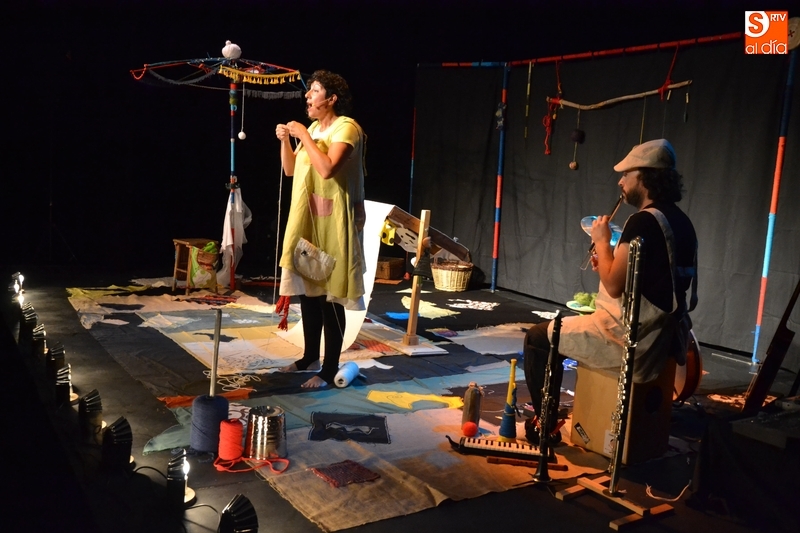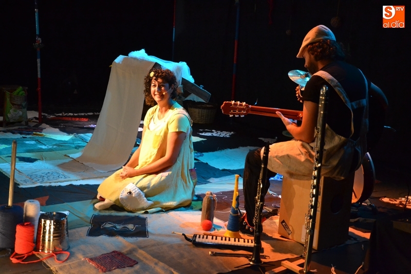 Posteriormente, la Feria hizo estreno en horario matinal -hasta ahora solo se había usado por las tardes-noches- de la Sala Esmark (el pabellón del IES Tierra de Ciudad Rodrigo), que acogió el montaje Retahilando protagonizado por Eugenia Manzanera. Junto a un músico, la tejedora, de nombre Sis Sas, fue tejiendo historias de un tiempo pasado, con objetos y canciones con aromas de países mediterráneos.