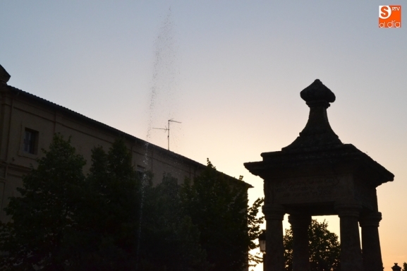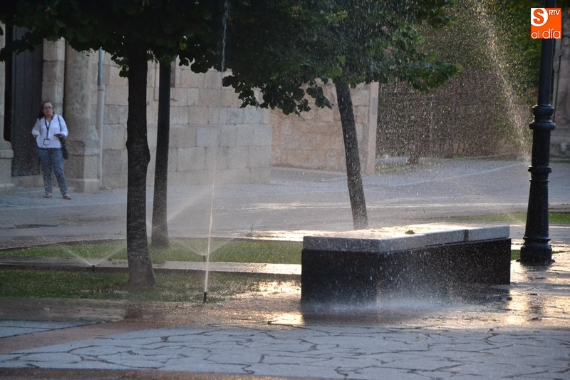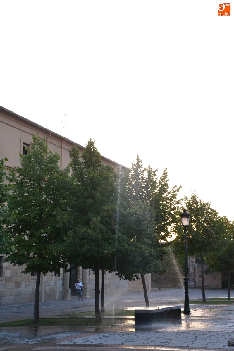 Como 'método' para refrescarse en pleno centro histórico, a última hora de la tarde del viernes se podía disfrutar de un 'géiser' improvisado en la Plazuela de Herrasti. Producto de una rotura directa o de una avería de uno de los aspersores de riego automático, el chorro del agua salía hacia arriba con gran fuerza.